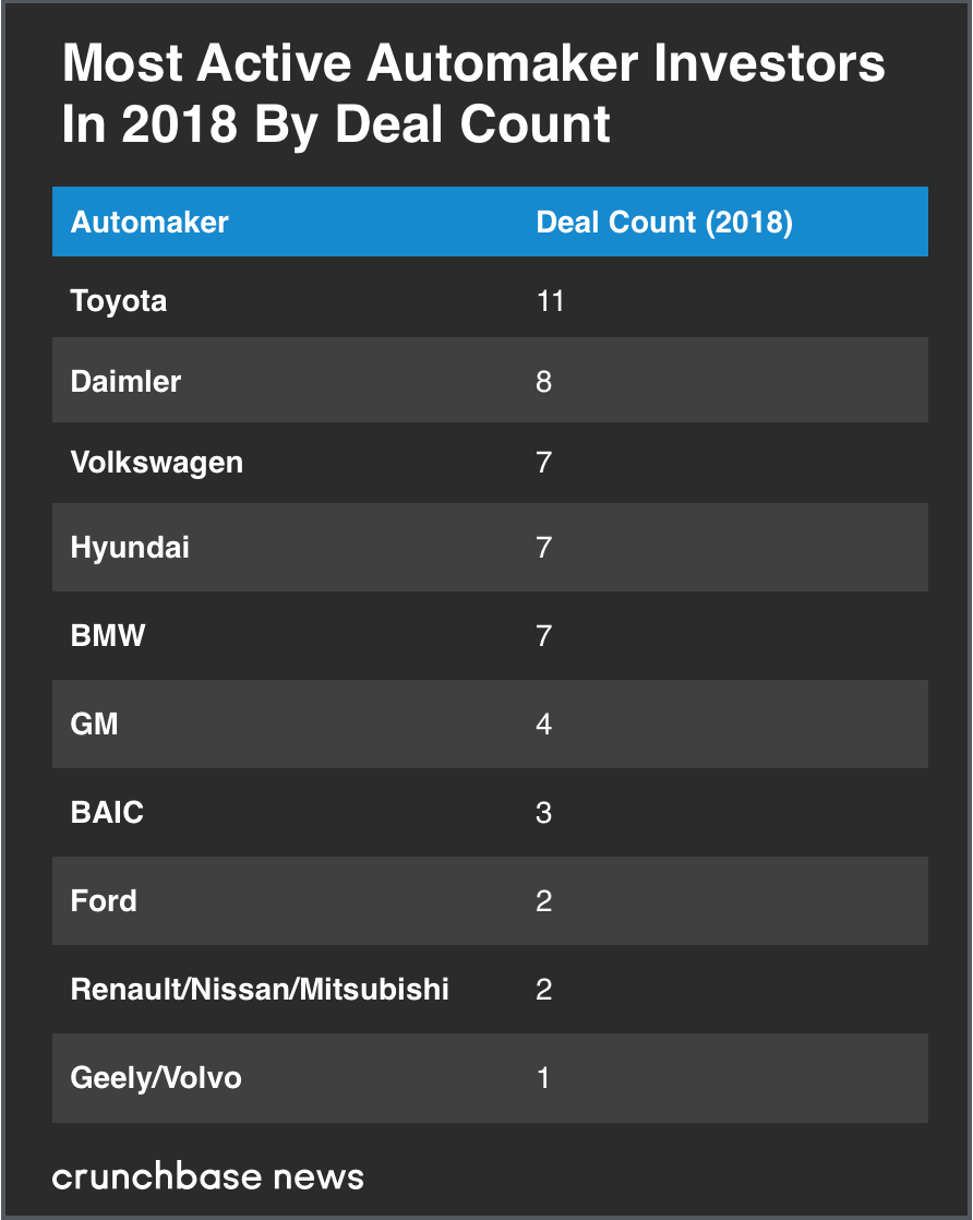 下表显示了他们参与的风险和种子投资。丰田、戴姆勒和大众汽车这三家最具价值的汽车制造商也是最多产的风险投资者。但是并非所有汽车制造商都参与了风险投资,例如,菲亚特克莱斯勒(Fiat Chrysler)就一直没有投资初创企业,它更倾向于通过与Alphabet的Waymo建立自动汽车合作伙伴关系。
