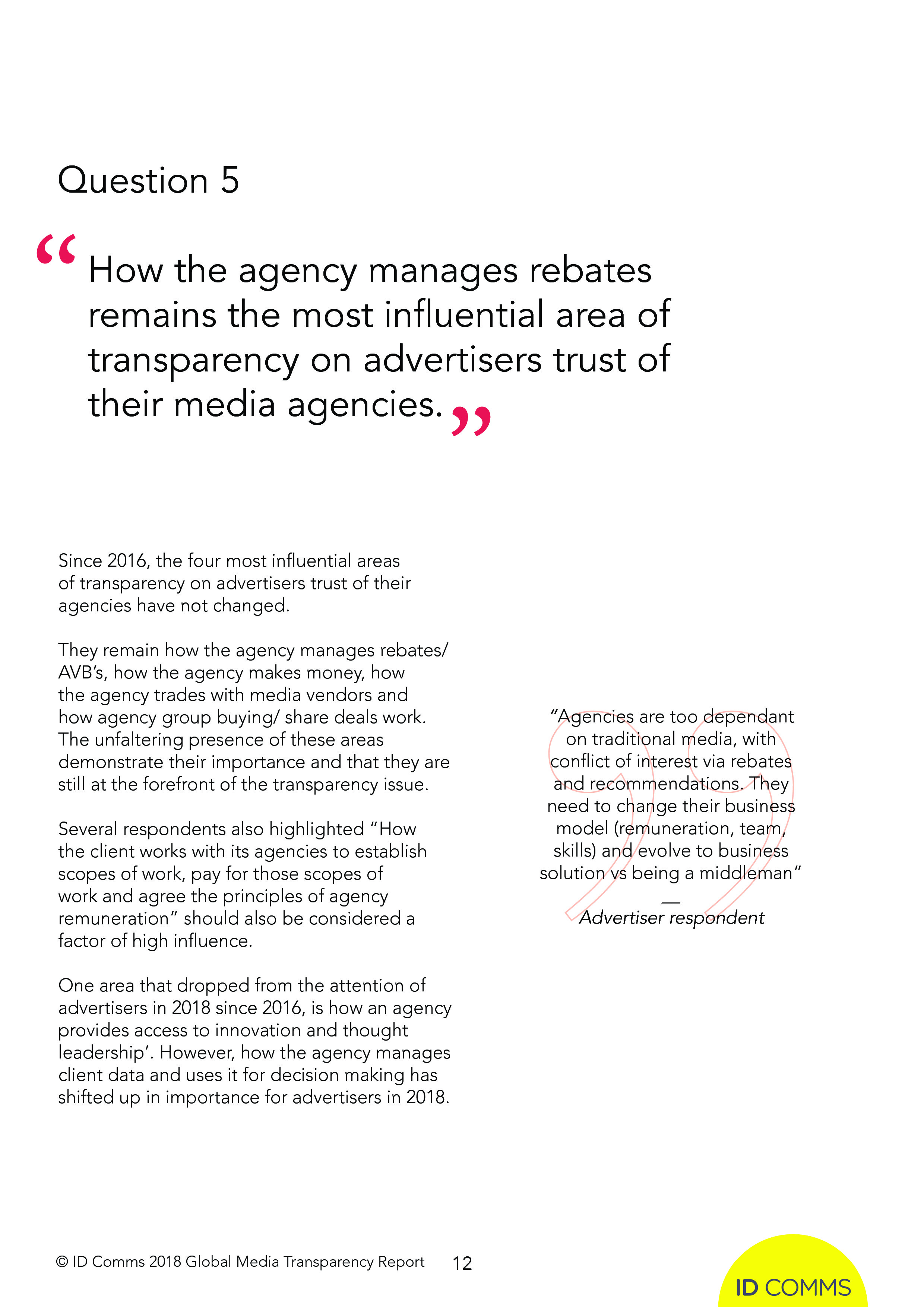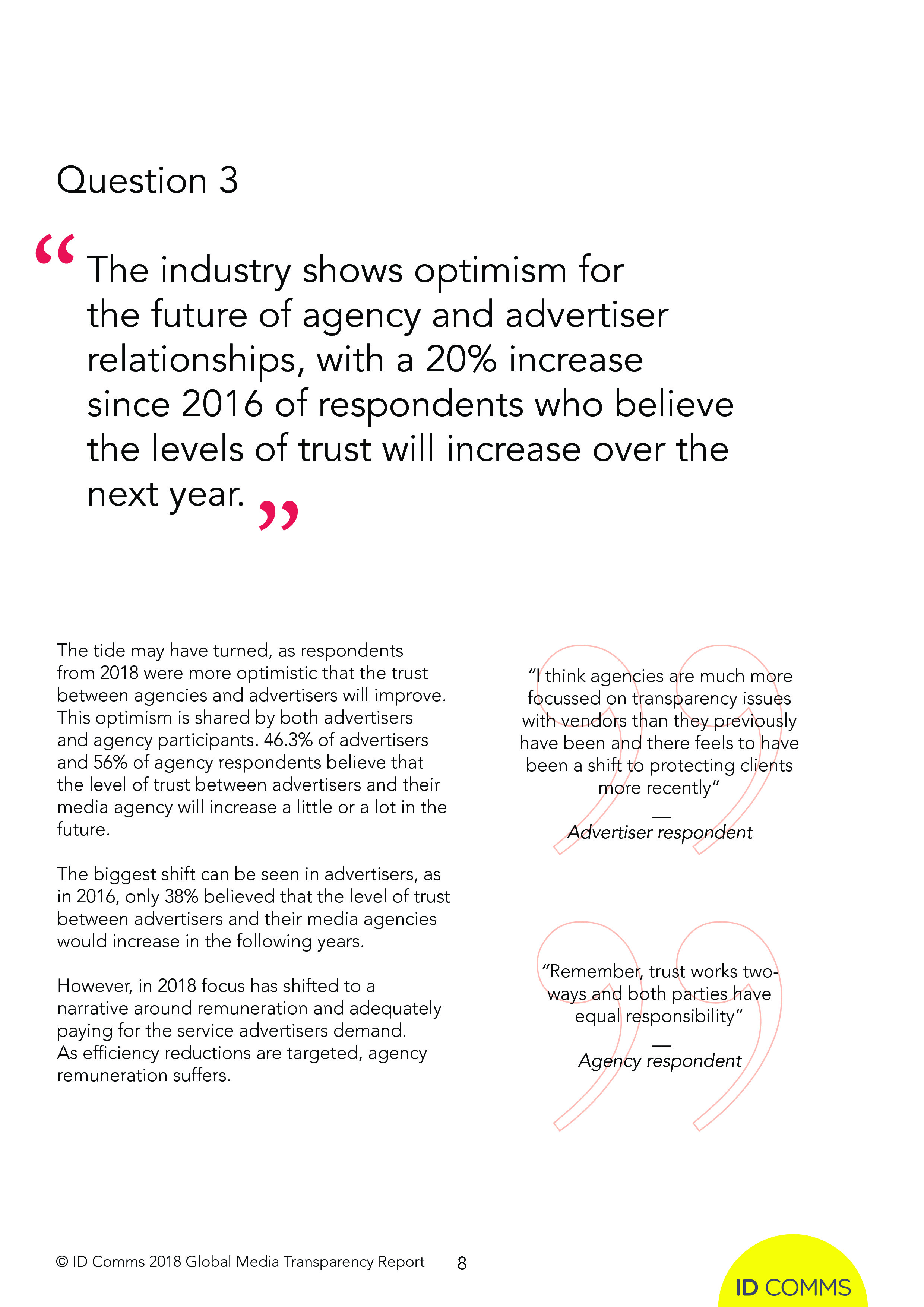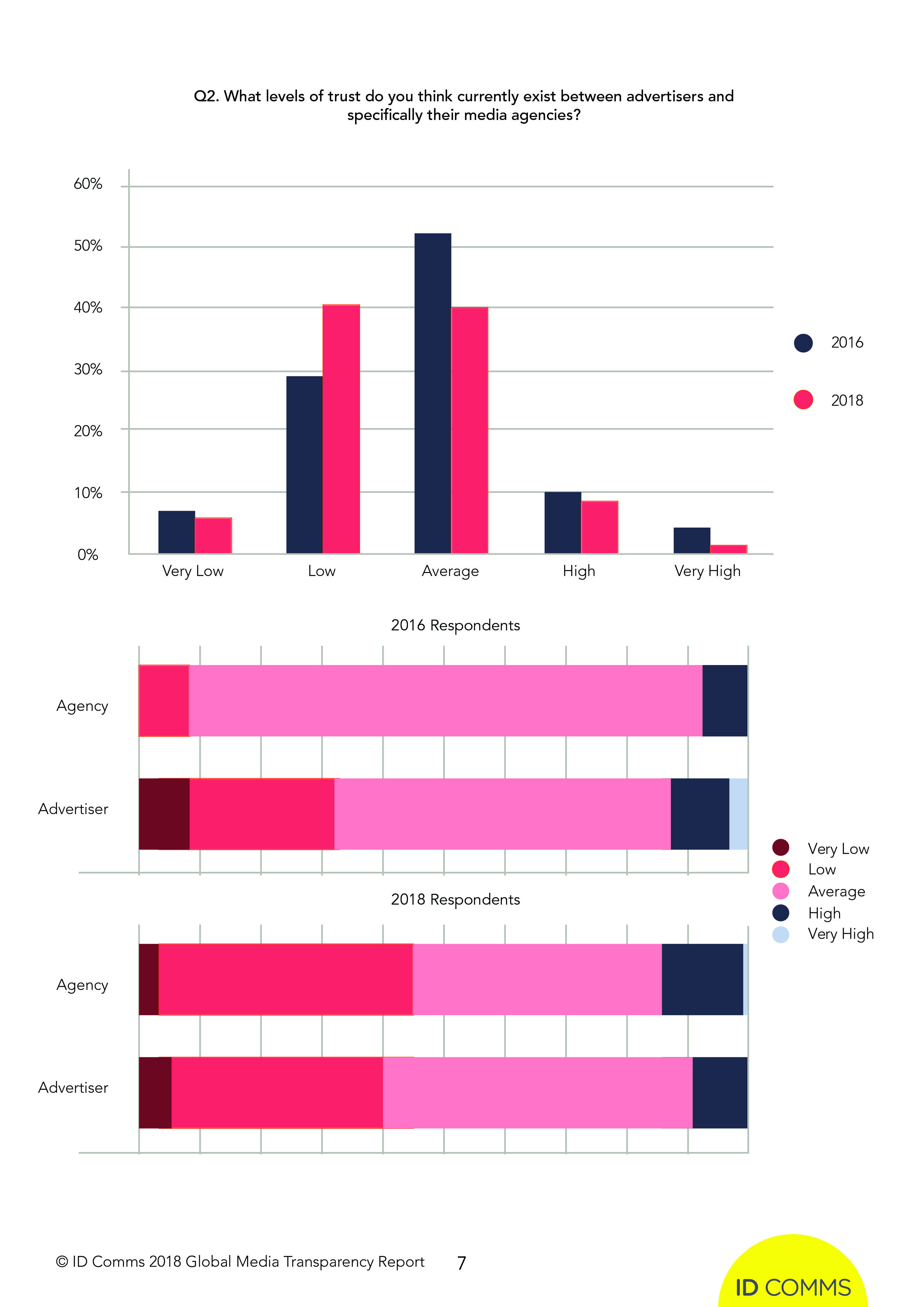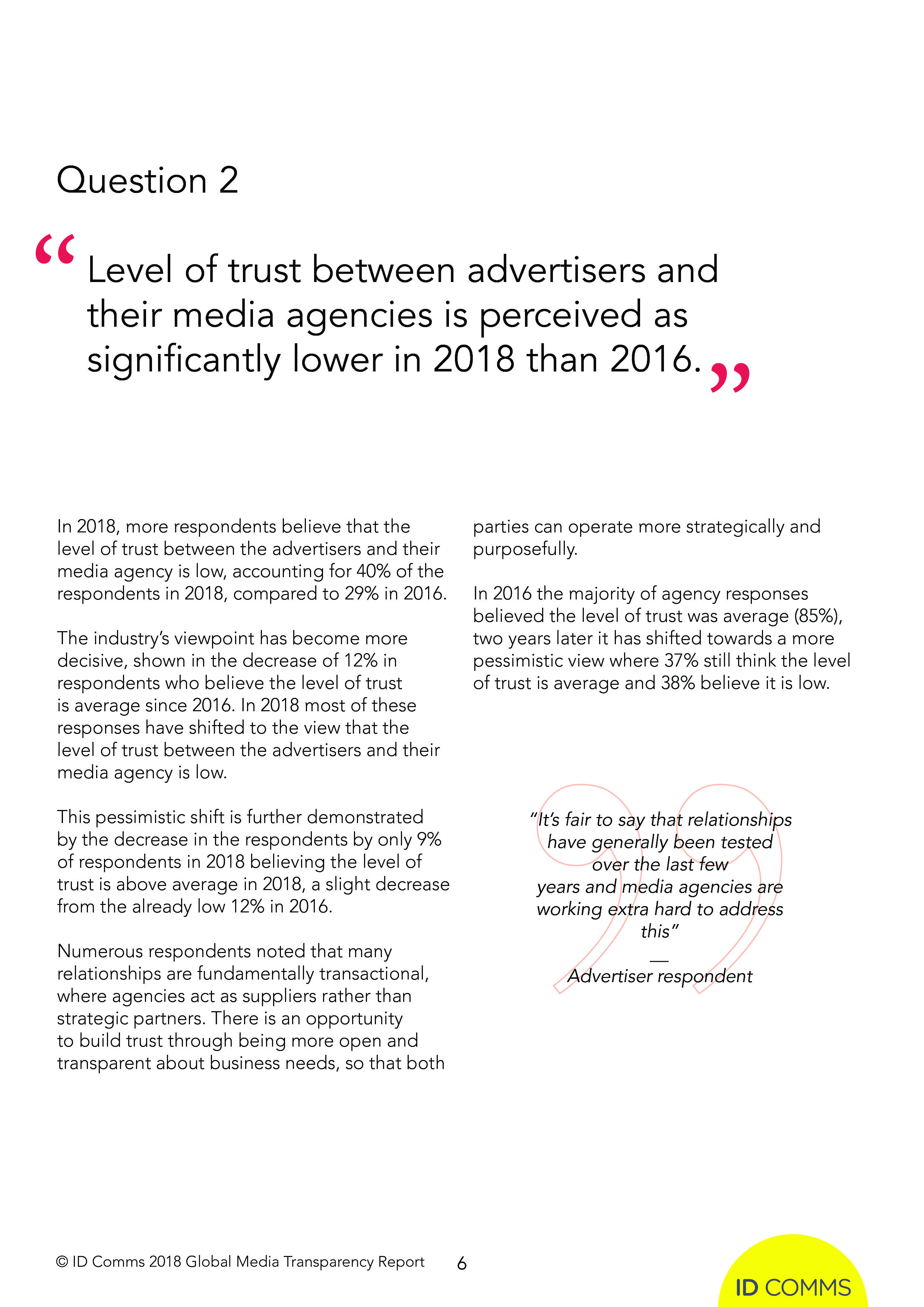 ID Comms顾问Susy Pyzer-Knapp将调查结果描述为“令人失望”,尤其是因为2016年的调查是在信任度特别低的时候进行的,那时透明度成为关注焦点,ANA正在调查美国媒体回扣问题。