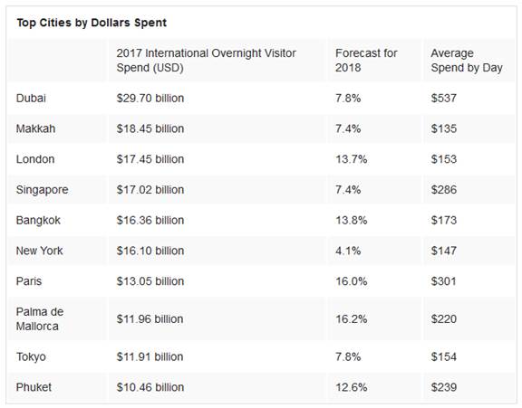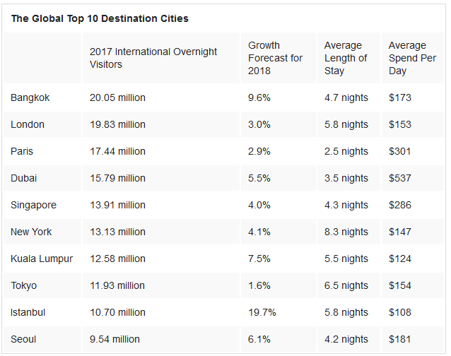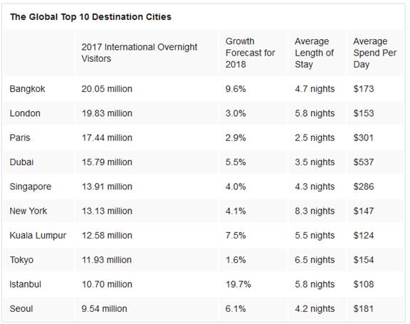 曼谷拥有约2000万国际过夜游客,位居榜首,2018年的增长率为9.6%,游客往往会在曼谷住4.7晚,每天花费173美元。