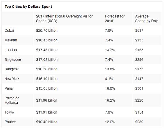 游客在当地花费的金额方面,并非所有城市都是平等的。迪拜仍然是排名最高的目的地城市,过夜游客平均每天花费高达537美元。西班牙的Palma de Mallorca和泰国的普吉岛排名第二。在访问量最大的城市中,伊斯坦布尔的平均每日支出最低,仅为108美元。