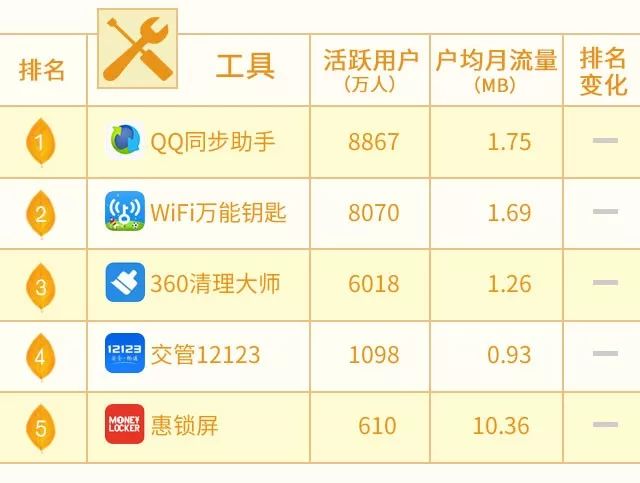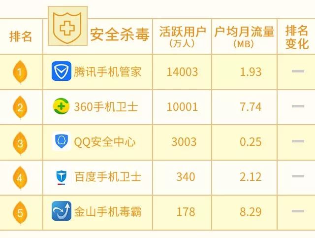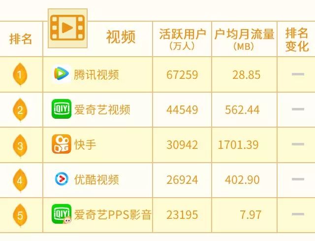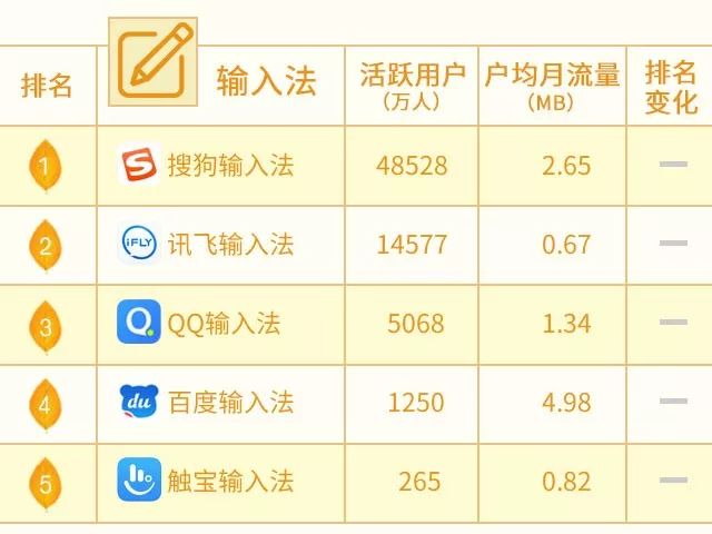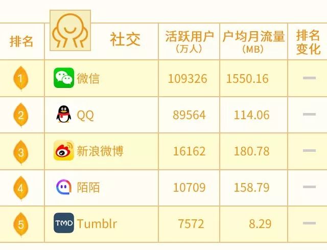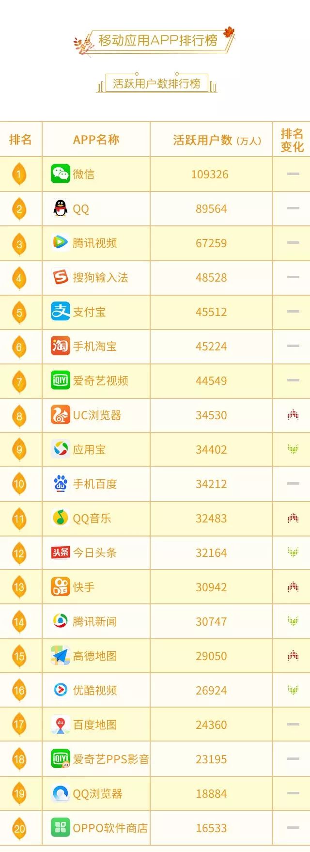 本期移动应用活跃用户排行榜TOP5延续8月格局,微信、QQ、腾讯视频、搜狗输入法、支付宝稳坐宝座,BAT的T(腾讯)将前三收入囊中、实属霸气登顶~