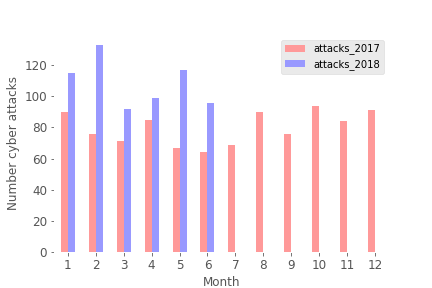 - 2018年每月的网络攻击事件都比上一年有所增长