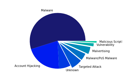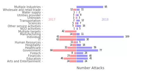 而在攻击目标方面,个人是最多的攻击对象。2017年有61起个人攻击事件,今年已经又169起。紧随其后的是健康医疗领域和金融领域的公司。其他像是科学、交通或者服务业等受影响较小。
