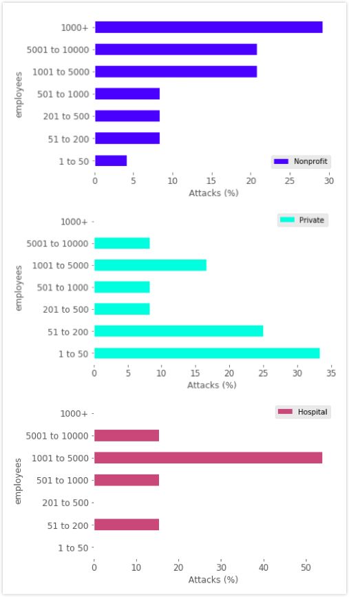 非营利组织类别中,网络攻击数随组织规模增长而增多。大约30%的攻击发生在拥有超过1万雇员的机构。而比较意外的是,私人公司类别中,呈现了相反的趋势。雇员增长而攻击数下降。人数在50人以下的公司受到的攻击数最多,说明他们在网络安全方面缺乏投入。而医院类别方面,没有明显的趋势。超过一半的攻击针对的是1000到5000人的医院,也许这是因为这样的规模是所有医院的平均水平,而更大或更小规模的医院已经被我归入其他两个类别中了。医院看起来最容易受到攻击。