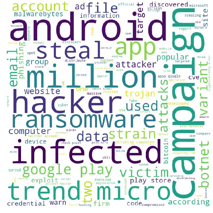 为了进一步了解针对个人的攻击的本质,我对这些攻击的描述文字进行处理和数据清洗后以词云形式呈现。出现较频繁的词是百万、事件、安卓和应用(app)。说明一些攻击常常在安卓用户下载app时出现,并同时影响数百万人。勒索软件的频率也在提高,这种攻击会远程锁住你手机的部分功能,让你无法获取自己的重要信息。