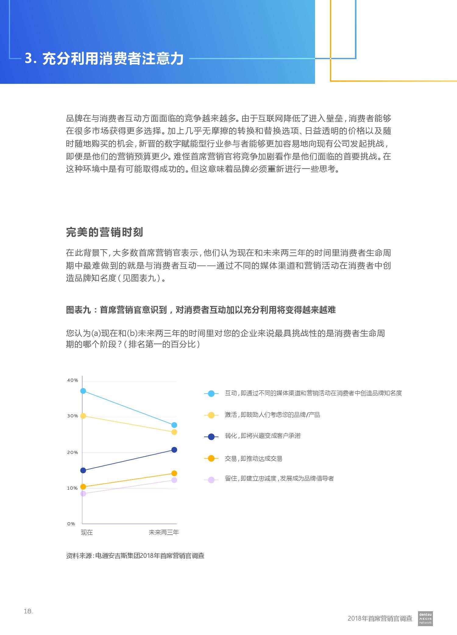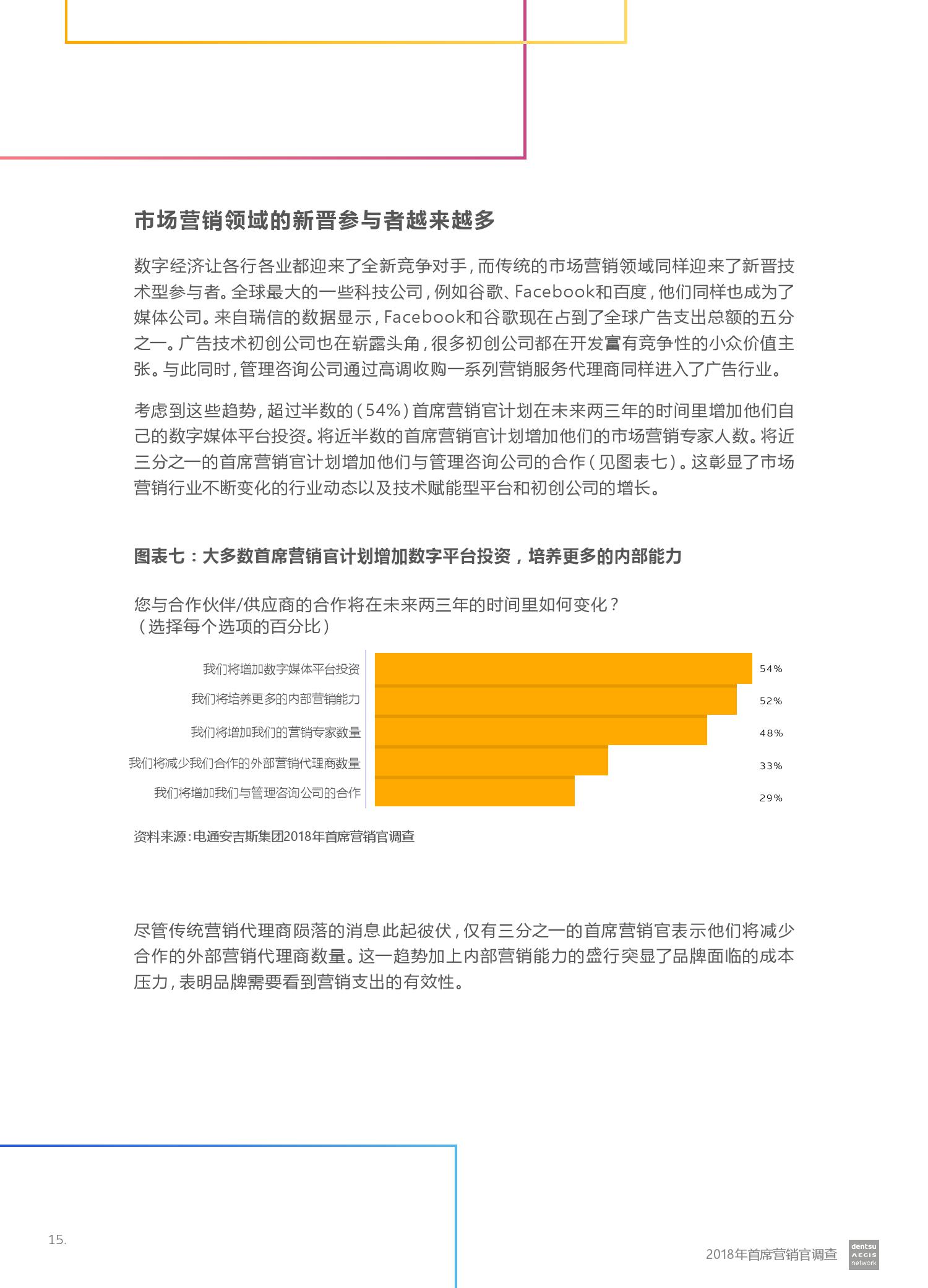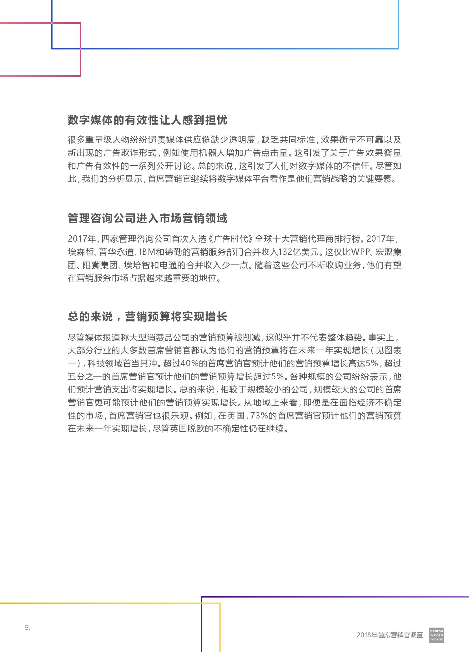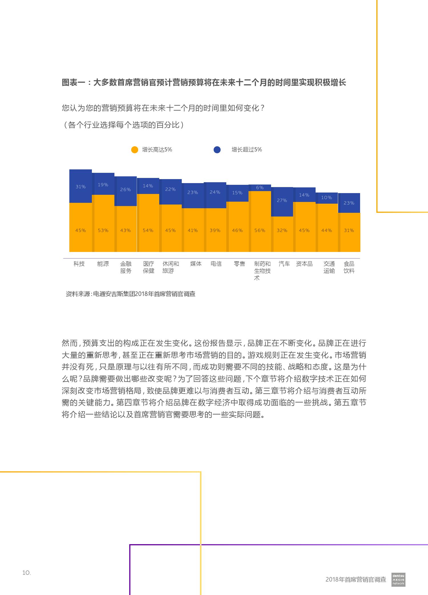 电通安吉斯集团发布最新《2018年CMO调查报告》(CMO Survey 2018)。报告显示,全球有三分之二的营销人员预计未来12个月的营销预算将会增加。然而,大型企业的营销预算增加更引人注目 – 43%的受访者计划增加5%或更多,而只有20%的受访者预计预算会下降。其中技术,汽车和金融服务行业的CMO对于未来营销预算增加的信心最强。