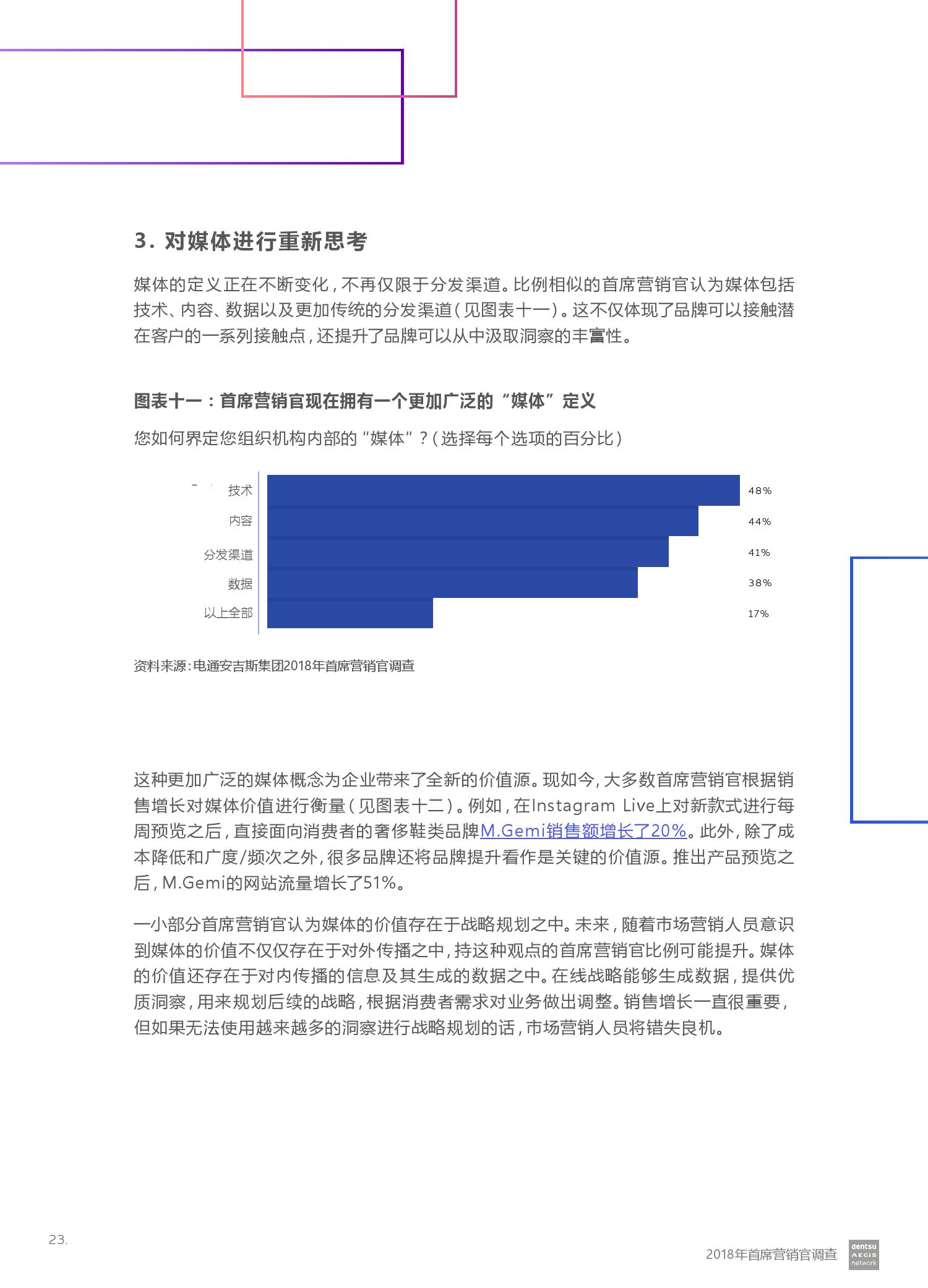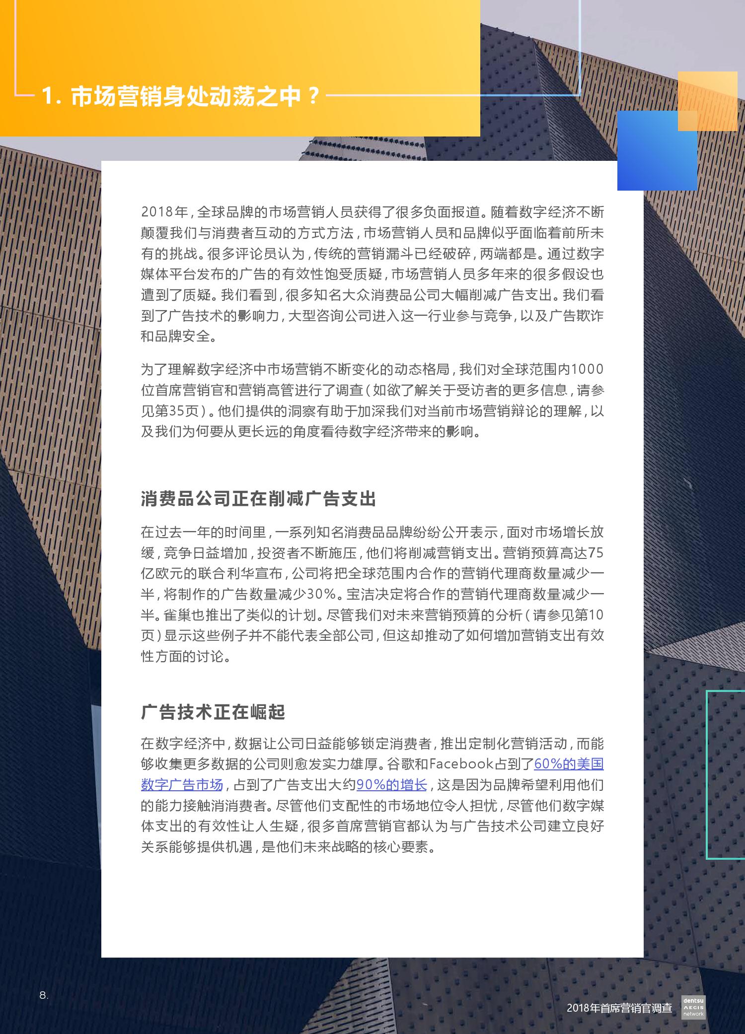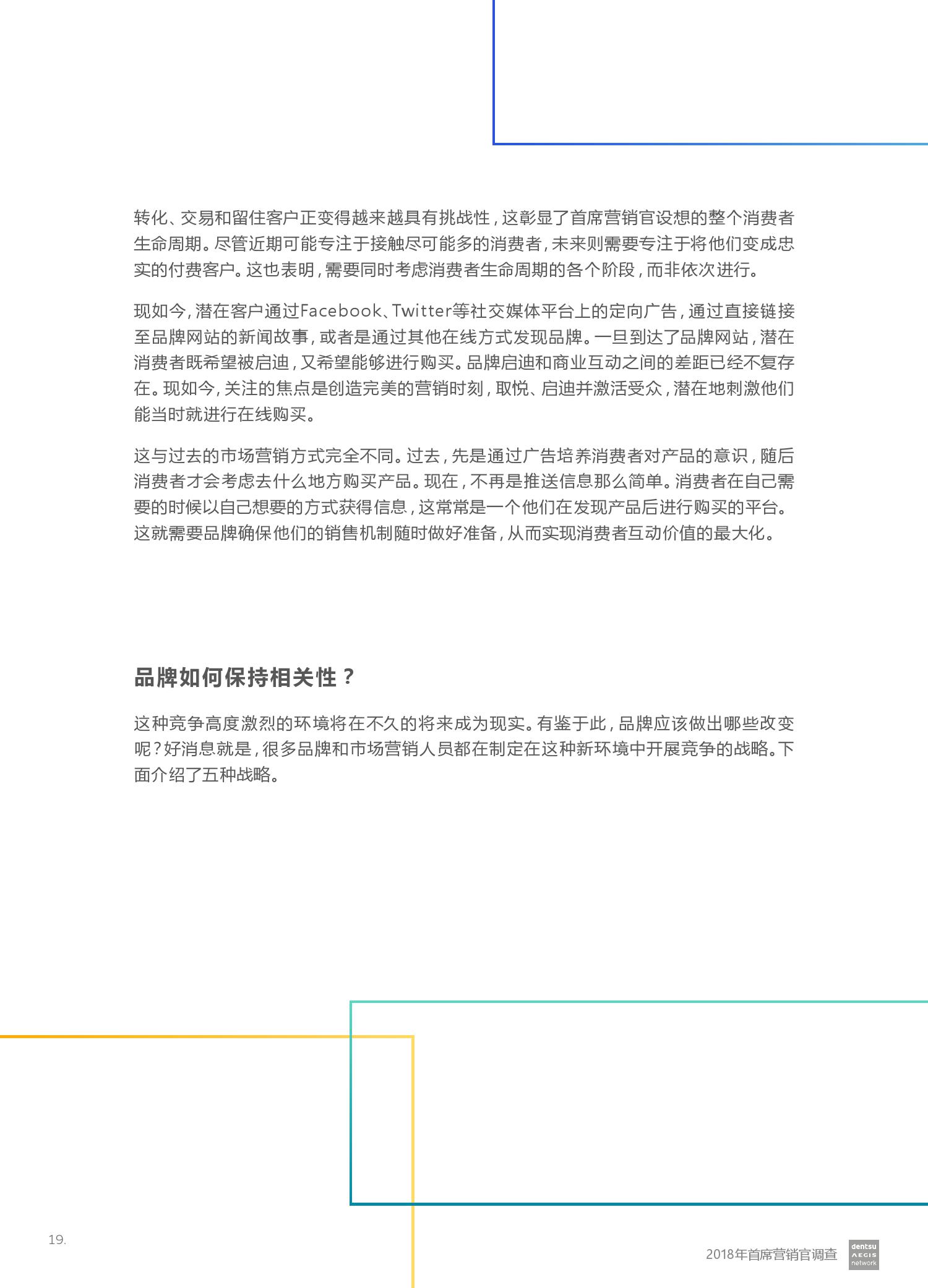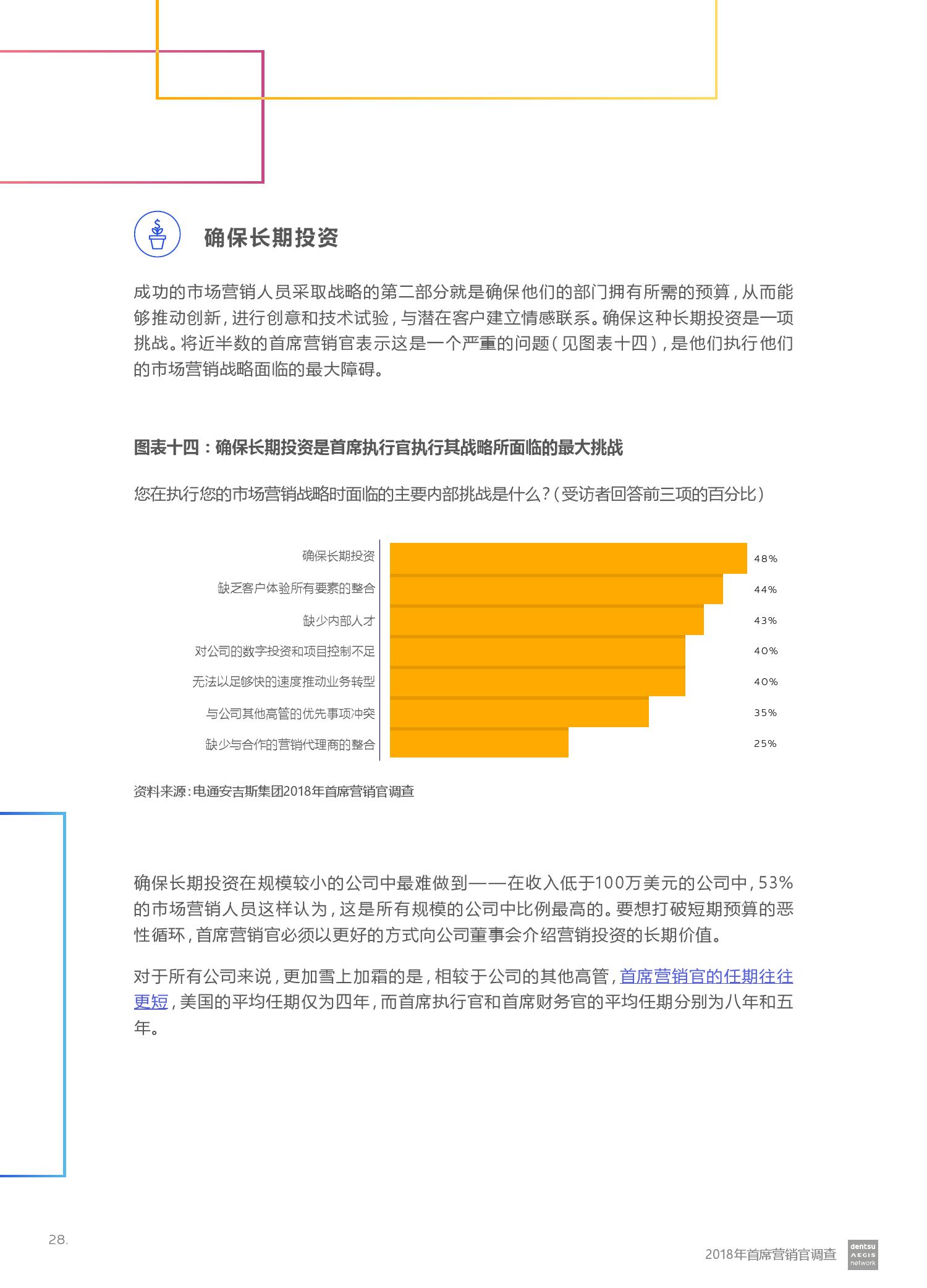 电通安吉斯集团发布最新《2018年CMO调查报告》(CMO Survey 2018)。报告显示,全球有三分之二的营销人员预计未来12个月的营销预算将会增加。然而,大型企业的营销预算增加更引人注目 – 43%的受访者计划增加5%或更多,而只有20%的受访者预计预算会下降。其中技术,汽车和金融服务行业的CMO对于未来营销预算增加的信心最强。