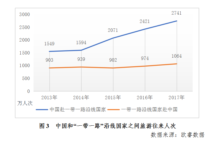 “一带一路”沿线国家赴中国旅游游客保持稳定增长,由2013年的903万人次,发展为2017年的1064万人次。中国出境到“一带一路”沿线国家的游客人次逐年攀升,由2013年的1549万人次,增长到2017年的2741万人次,五年间增长了77%,年均增速达15.34%。特别是随着2015年“一带一路”相关合作政策不断推向深入,中国赴“一带一路”沿线国家游客人次增长提速,中国之于“一带一路国家旅游经济发展的基石地位不断凸显。”