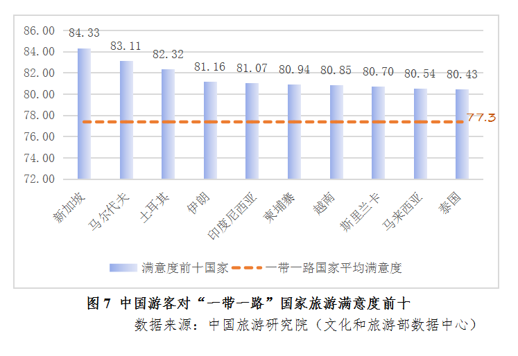 2018年上半年,中国游客赴“一带一路”国家平均满意为度77.36,新加坡、马尔代夫、土耳其游客满意度较高。此外,中国游客对新加坡的满意度居亚洲首位,对马尔代夫满意度居亚洲第四位,对土耳其满意度居欧洲地8位。