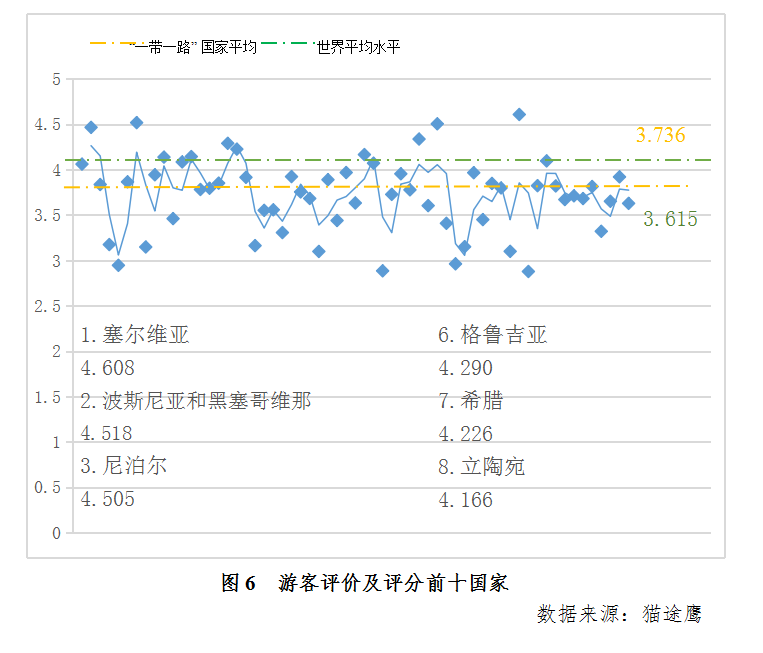“一带一路”国家旅游设施游客平均评价为3.736,高于世界游客平均水平3.615,综合评价超过4.0的国家有14个,超过世界平均水平的有42个,评价最高的国家为塞尔维亚。