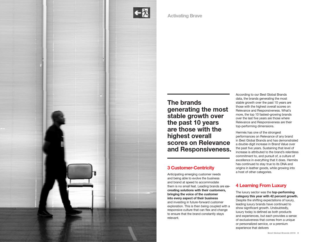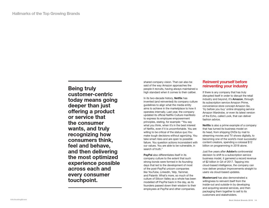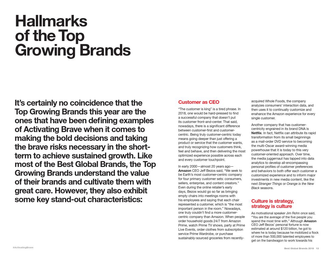 Interbrand公司称,亚马逊“几乎每年都会进行革新”,将以前较小的或失败的项目打造成成功的项目,例如Echo智能音箱和Prime视频服务中的获奖节目。亚马逊的时装业务已是美国第二大的时装品牌。