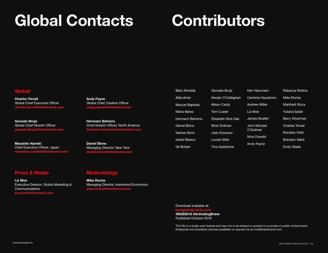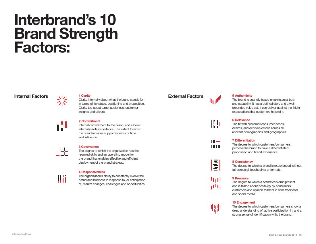 Interbrand公司对各个品牌的评分基于10个方面的考量:清晰度、责任感、治理、反应、相关性、参与度、差异性、持续性、真实度和覆盖率。苹果在参与度、差异化和持续性方面表现最强,它的品牌价值增长了16%,增长到了2144.8亿美元。
