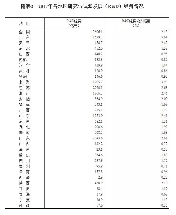 2017年,全国共投入研究与试验发展(R&D)经费17606.1亿元,比上年增加1929.4 亿元,增长12.3%,增速较上年提高1.7个百分点;研究与试验发展(R&D)经费投入强度(与国内生产总值[1]之比)为2.13%,比上年提高0.02个百分点。按研究与试验发展(R&D)人员(全时工作量)计算的人均经费为43.6万元,比上年增加3.2万元。