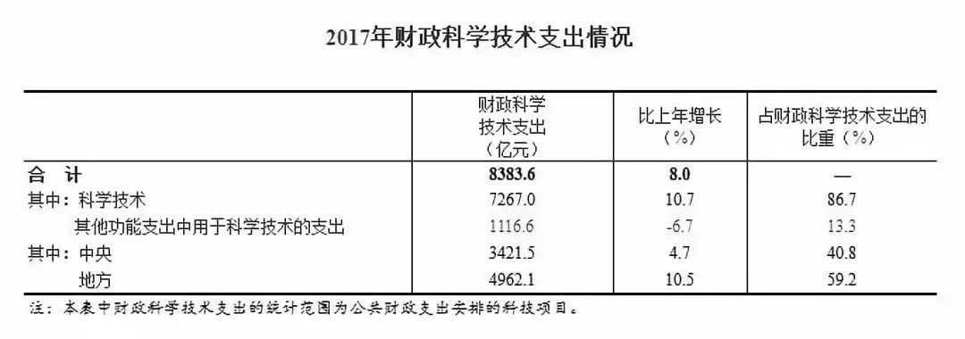 2017年,国家财政科学技术支出8383.6亿元,比上年增加622.9亿元,增长8%;财政科学技术支出占当年国家财政支出的比重为4.13%,与上年持平。其中,中央财政科学技术支出3421.5亿元,增长4.7%,占财政科学技术支出的比重为40.8%;地方财政科学技术支出4962.1亿元,增长10.5%,占比为59.2%。