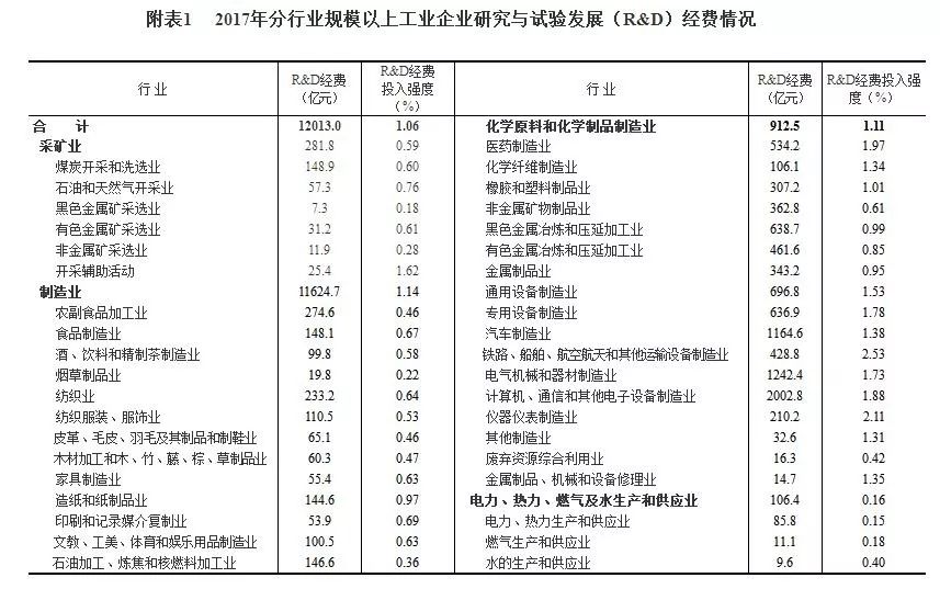 分产业部门看,高技术制造业研究与试验发展(R&D)经费3182.6亿元,投入强度(与主营业务收入之比)为2%,比上年提高0.1个百分点;装备制造业研究与试验发展(R&D)经费6725.7亿元,投入强度为1.65%,比上年提高0.14个百分点。在规模以上工业企业[2]中,研究与试验发展(R&D)经费投入超过500亿元的行业大类有8个,这8个行业的经费占全部规模以上工业企业研究与试验发展(R&D)经费的比重为65.2%;研究与试验发展(R&D)经费投入在100亿元以上且投入强度超过规模以上工业企业平均水平的行业大类有10个(分行业情况详见附表1)。