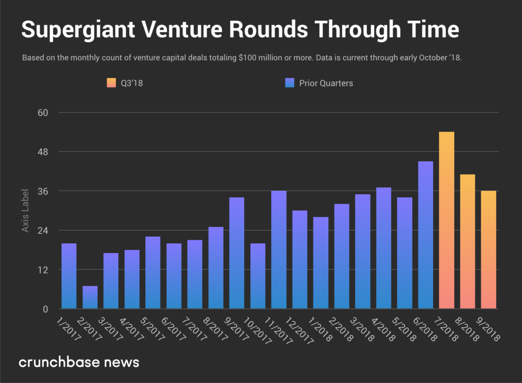 根据Crunchbase的最新数据,2018年第三季度全球风险投资依然呈上涨趋势。企业获得1亿美元或更多投资的交易称为“超巨型”风险投资。过去,每个季度只有9-10宗“超巨型”投资,现在这样的交易很多,甚至无法统计。