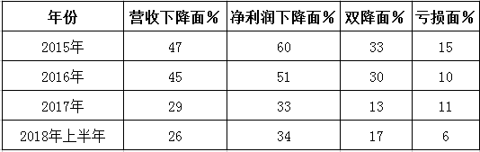 从2015年到2017年,零售业上市公司的营收下降面、净利润下降面、营收与净利润双降面以及亏损面,除2017年亏损面比上年扩大了1个多百分点外,其他指标都逐年下降,业绩下滑得到有效控制,下降幅度逐年收窄。但2018年上半年营收下降面与亏损面虽然有一定的下降,但净利润下降面与两项指标双降面都有所扩大,如表1所示。