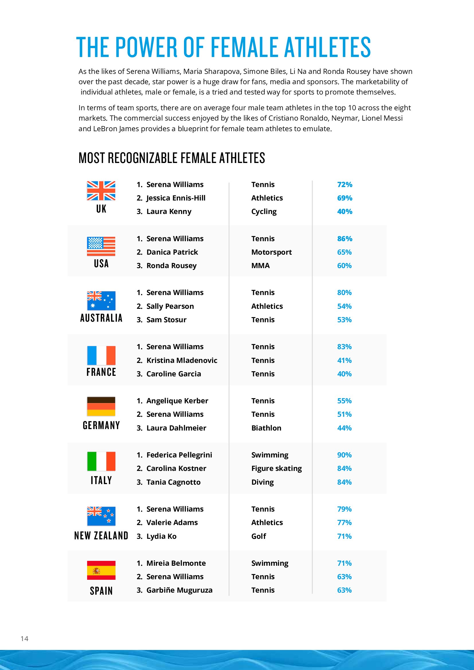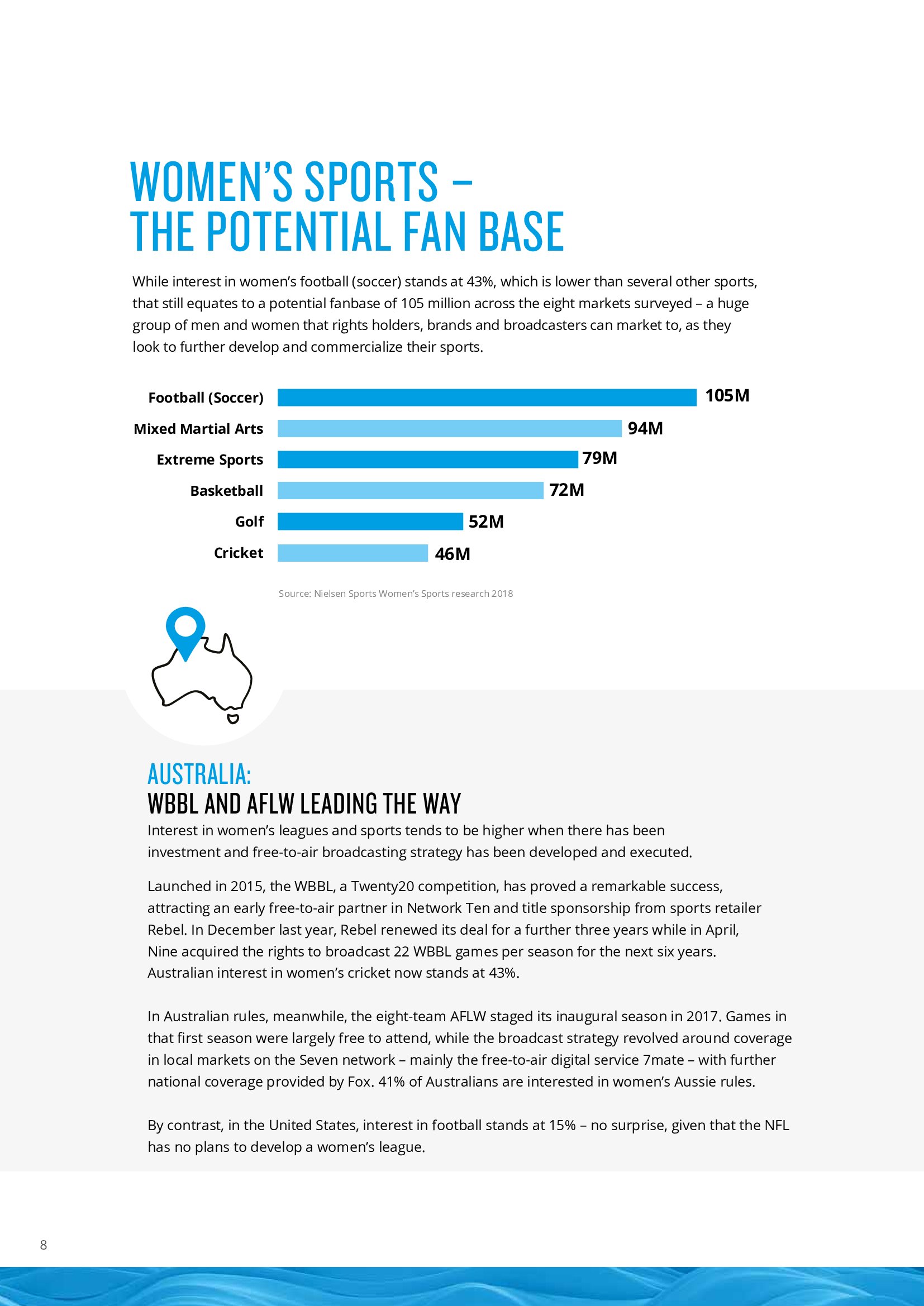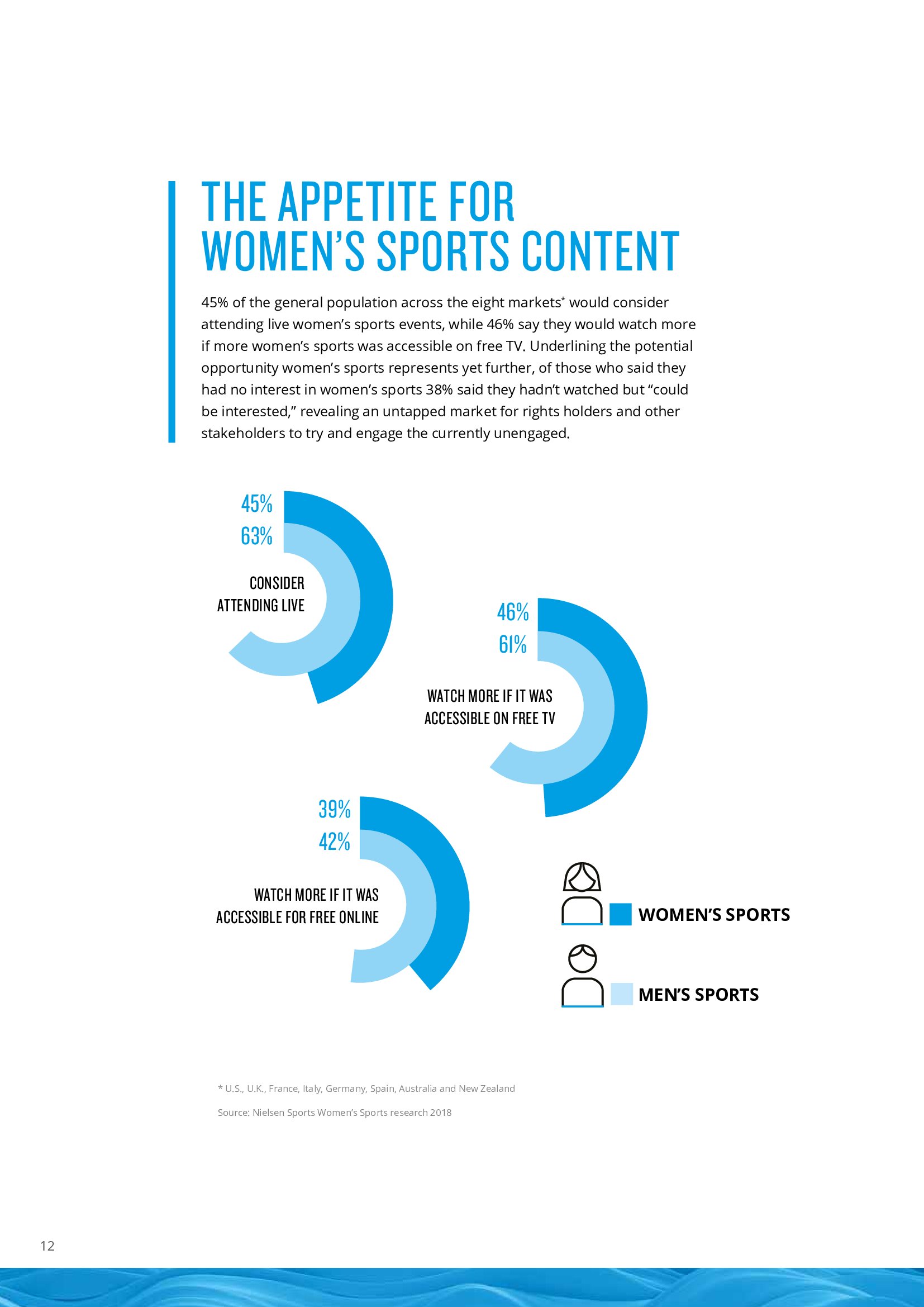 针对全球八个主要市场(美国、英国、法国、意大利、德国、西班牙、澳大利亚和新西兰)的调查发现,84%的体育迷对女性体育感兴趣,其中51%是男性,这证实了女性的体育活动可以同时吸引男性和女性观众,而且观众的性别比例更平衡。