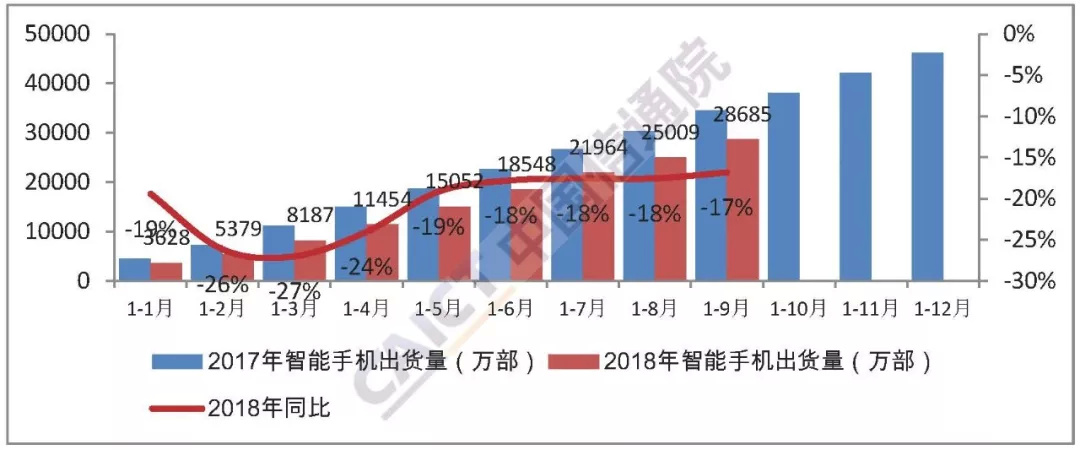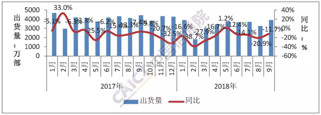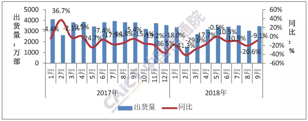 9月份国内手机市场总体出货量环比增长近两成,前三季度出货量累计超过3亿部。2018年9月,国内手机市场出货量3902.2万部,同比下降11.7%,环比增长19.7%; 2018年1-9月,国内手机市场出货量3.05亿部,同比下降17.0%。