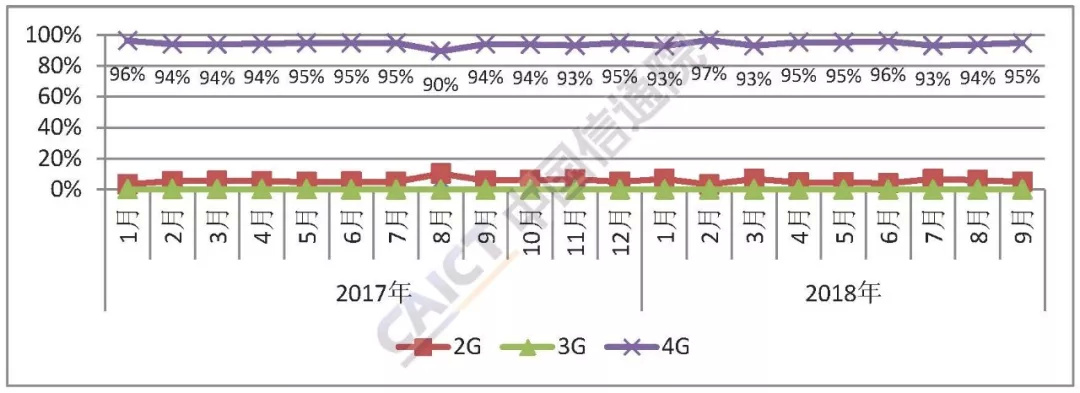 4G手机出货量占比超九成。2018年9月,4G手机出货量3701.2万部,同比下降11.0%,在同期国内手机出货量中占比94.8%,4G手机中双4G产品占比99.8%;另有2G、3G手机出货量分别为200.2万部、0.8万部,同比分别下降22.6%和增长529.9%。2018年1-9月,2G手机出货量1676.2万部,同比下降19.7%;3G手机出货量4.9万部,同比下降90.9%;4G手机出货量2.88亿部,同比下降16.7%。(注:双4G手机指同时支持TD-LTE和LTE FDD两种4G网络制式的手机)