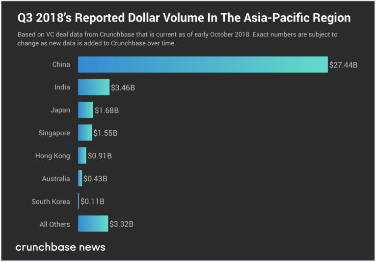 2018年第三季度,中国大陆再次主导了亚太地区的投资格局。除了占该地区已知风险投资总额的近71%之外,对中国大陆初创企业的交易占该地区投资交易的66%以上。
