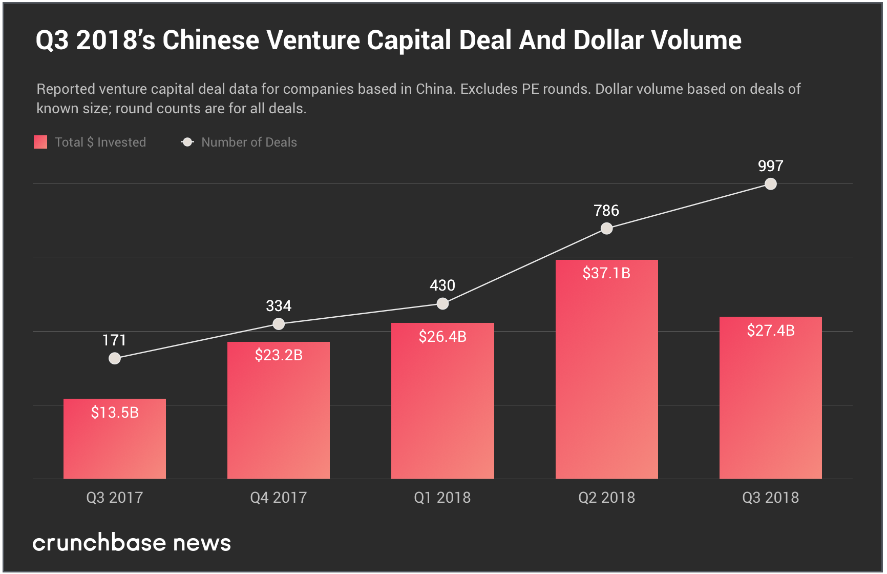 在2018年第三季度,中国完成了54宗超巨型投资,其中一半是超过2亿美元的交易,其中五宗投资额超过10亿美元。事实上,第二季度中国完成了57宗超巨型投资。
