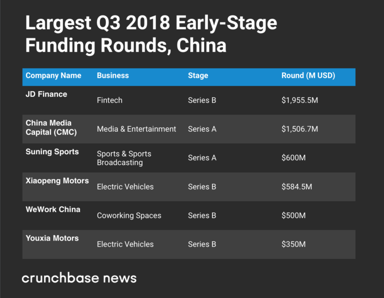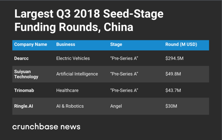 2018年第三季度种子阶段投资数量较前一季度增长204%。中国最大的种子交易是电动汽车制造商Dearrc获得2940亿美元投资。