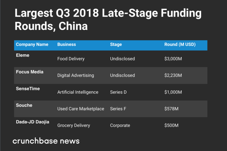 第三季度,中国最大的后期交易饿了么获得3亿美元融资,投资方包括软银和阿里巴巴。