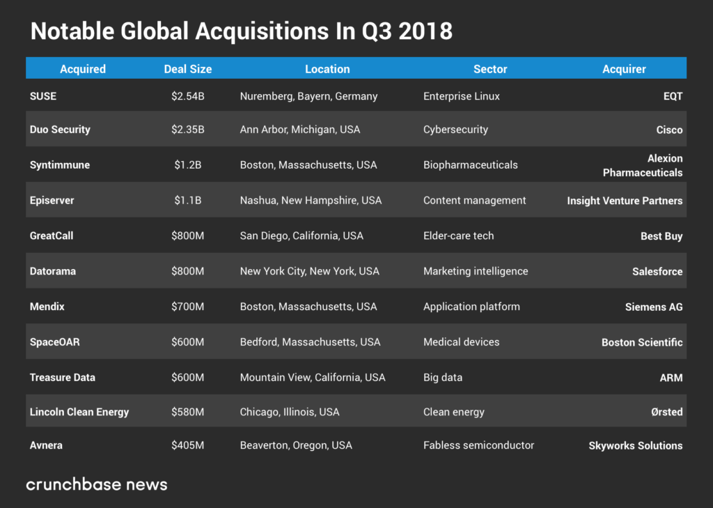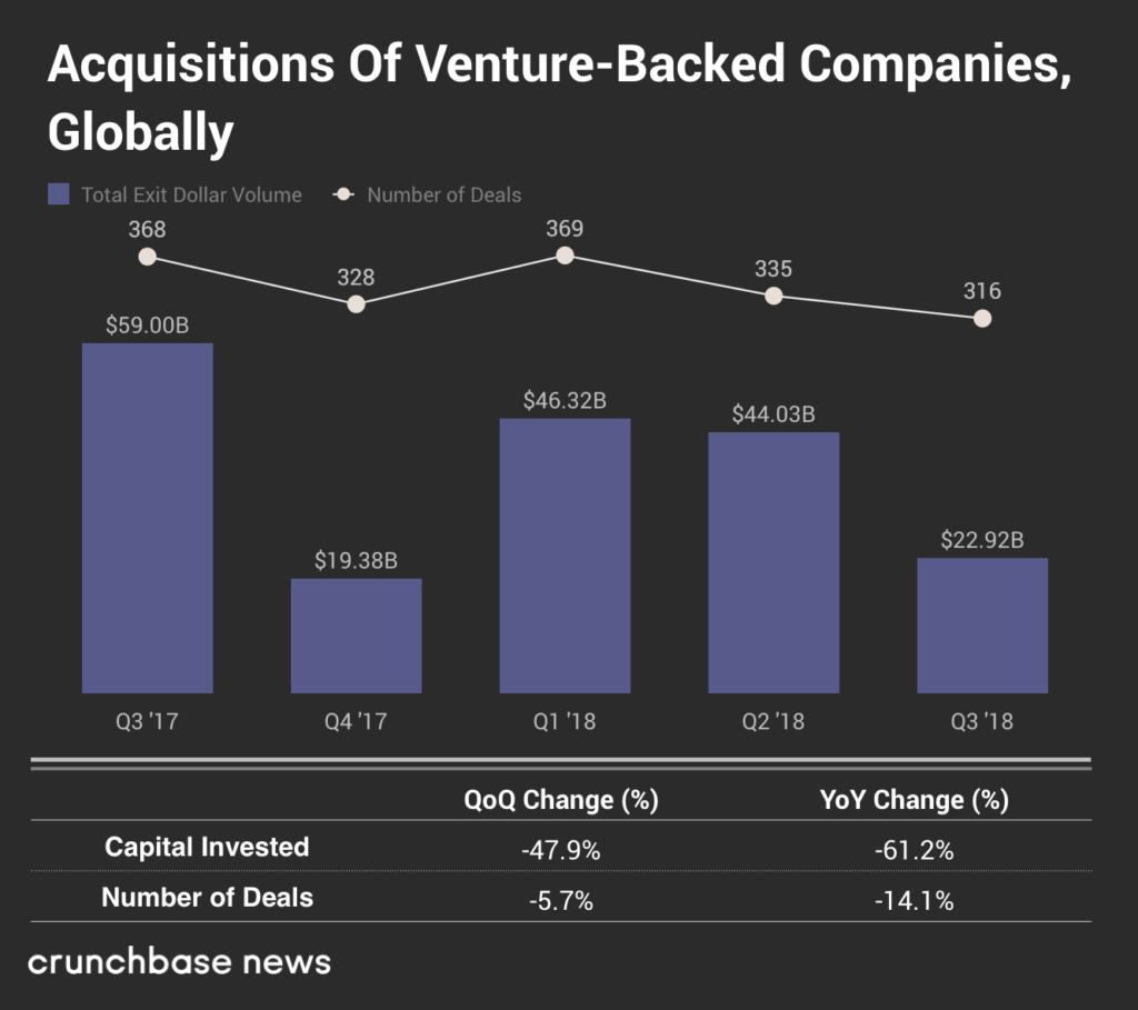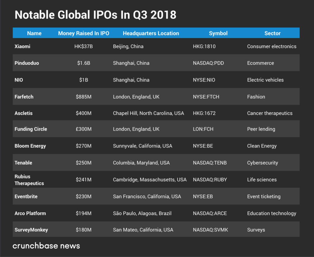 Crunchbase发布了2018年第三季度全球投资退出情况。