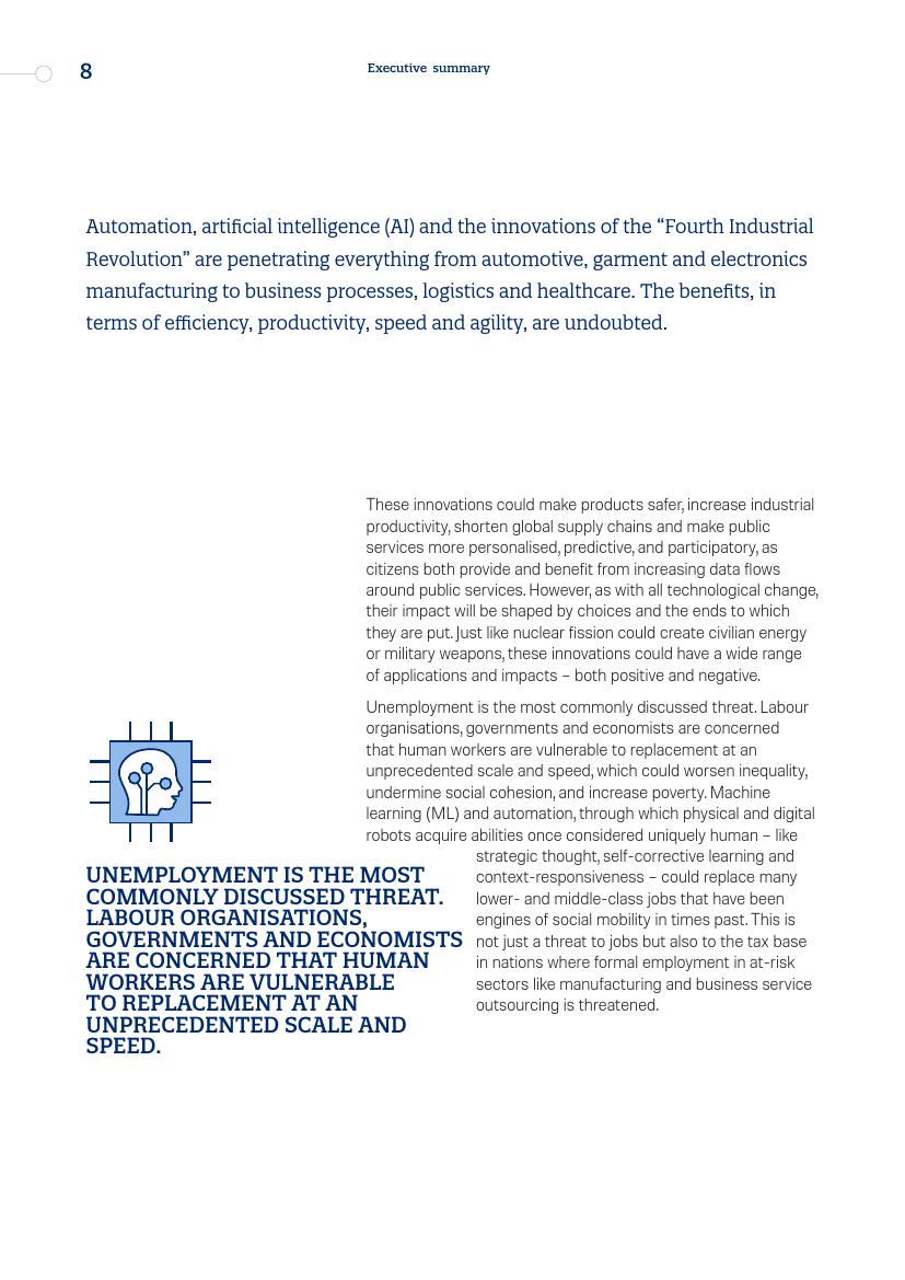 政府、公共机构、私营部门和民间社会所作的选择,决定了技术的使用目的和风险管理水平,第四次工业革命使人兴奋,创新企业承诺将创造一个高效、高生产力和进步的世界。随着这些工具在范围、速度和灵活性等方面的进步,它们加剧了人们对技术驱动下失业和不平等的担忧。