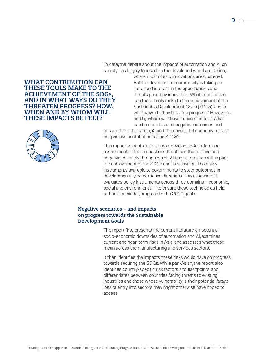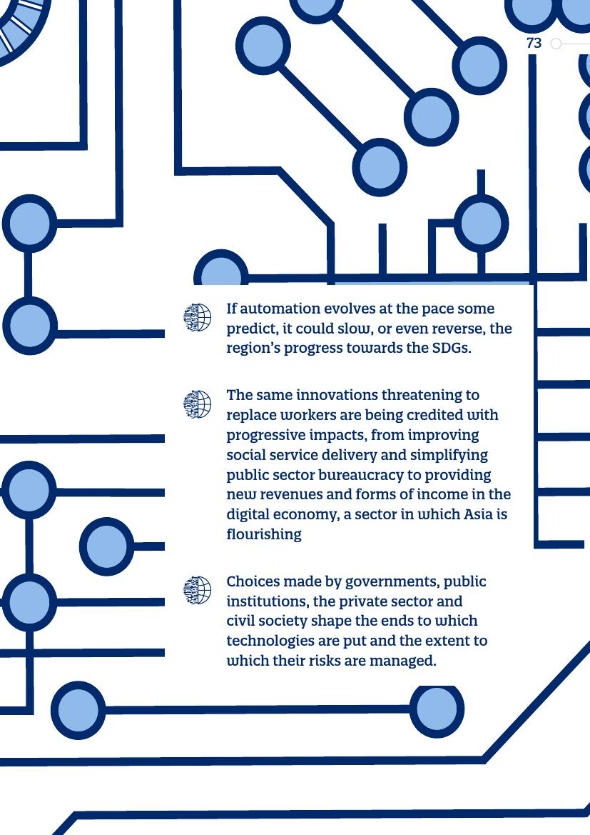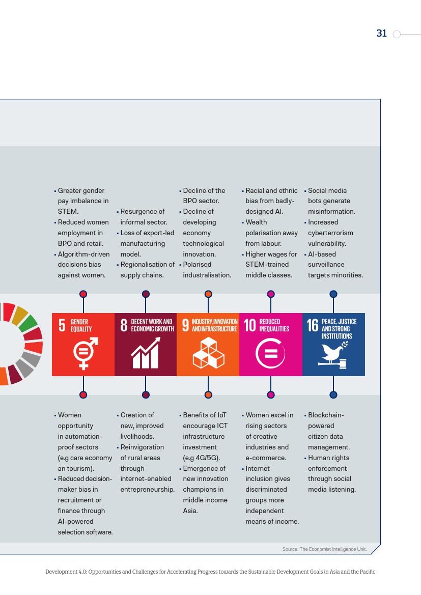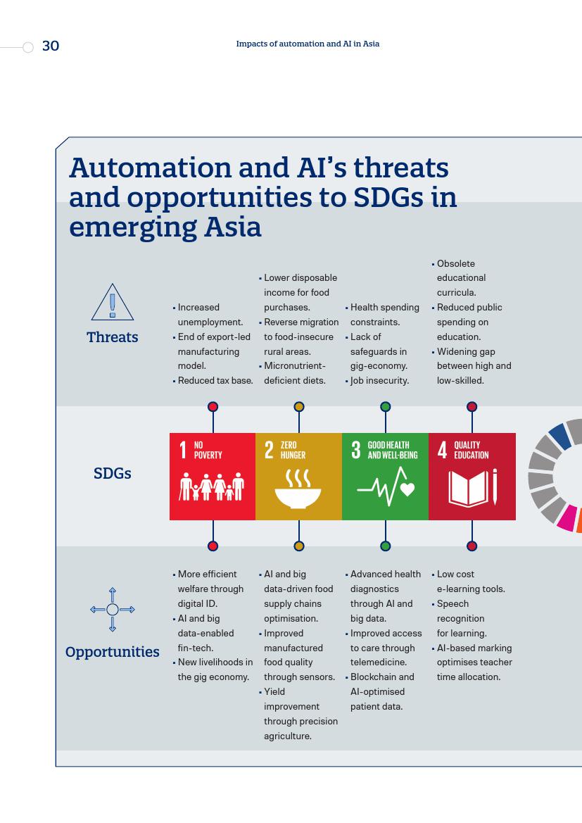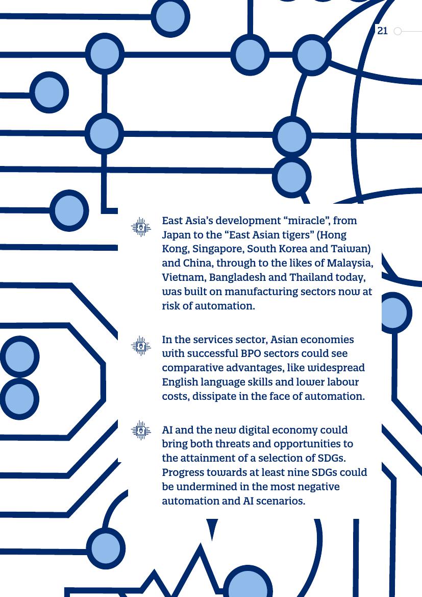 东亚的发展“奇迹”,从日本到“亚洲四小龙”,再到今天的马来西亚、越南、孟加拉国和泰国,其发展都建立在制造业领域,而现在,制造业面临自动化的风险。在服务业,面对自动化,广泛普及的英语技能以及低劳动力成本所带来的优势正在消失。人工智能和新的数字经济对实现一系列可持续发展目标来说,意味着即是机遇又是挑战。在最负面的自动化和人工智能情景中,至少九个可持续发展目标的进程可能会受到较大影响。