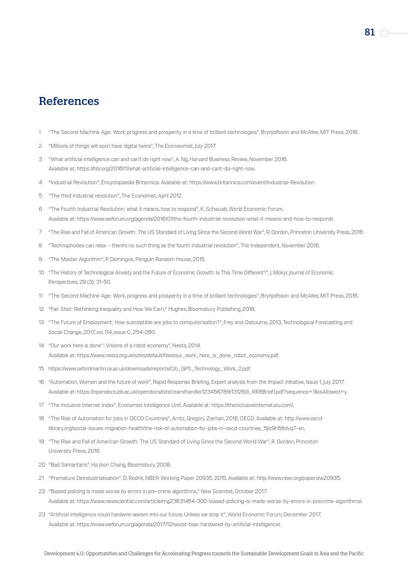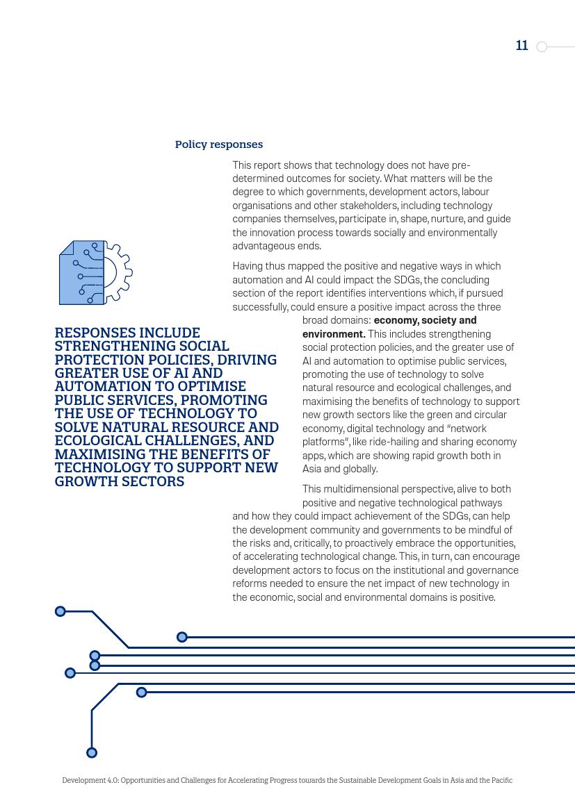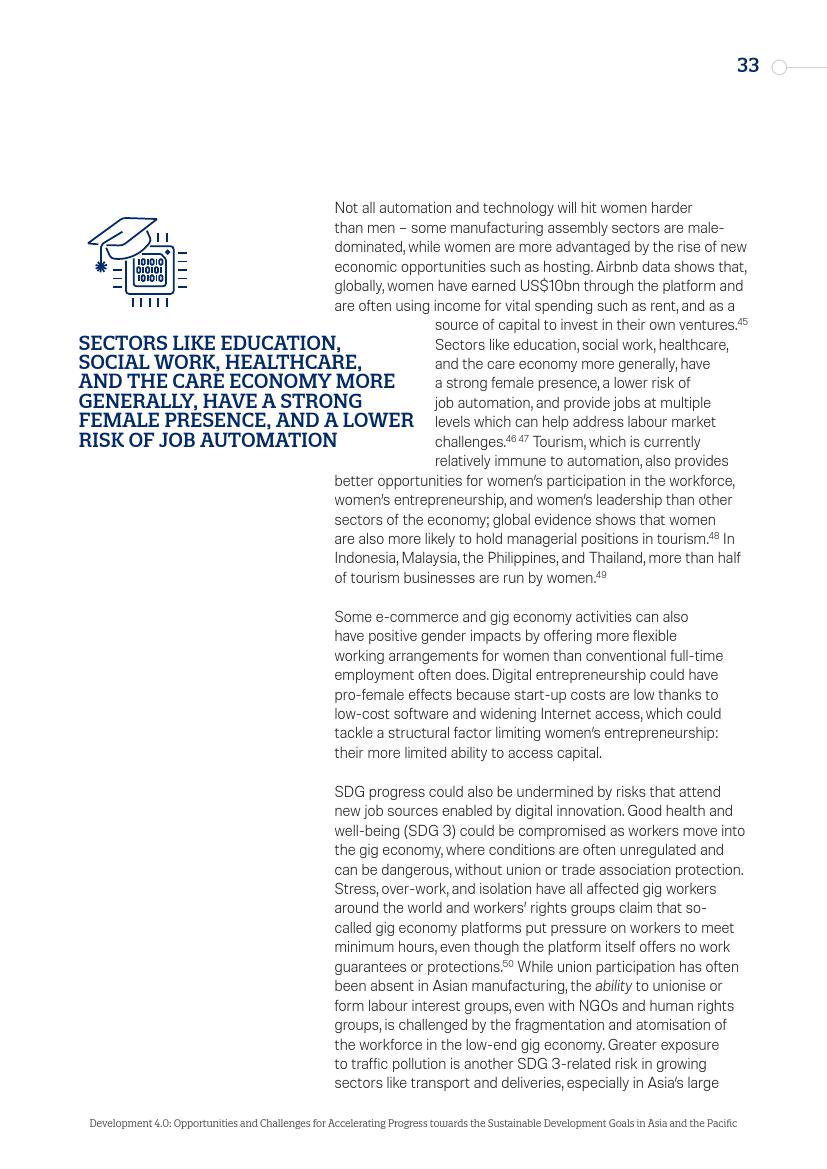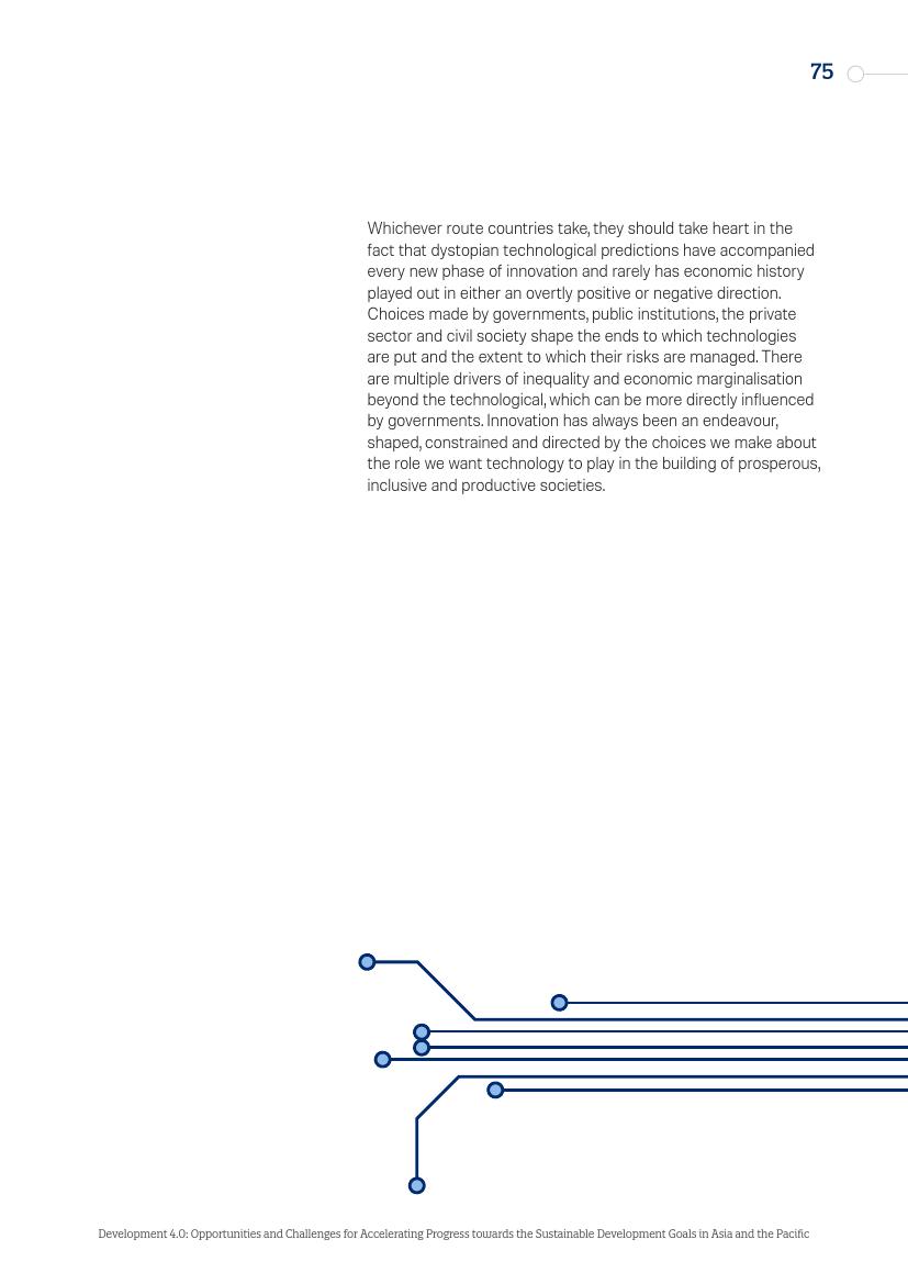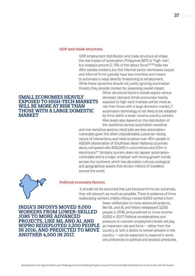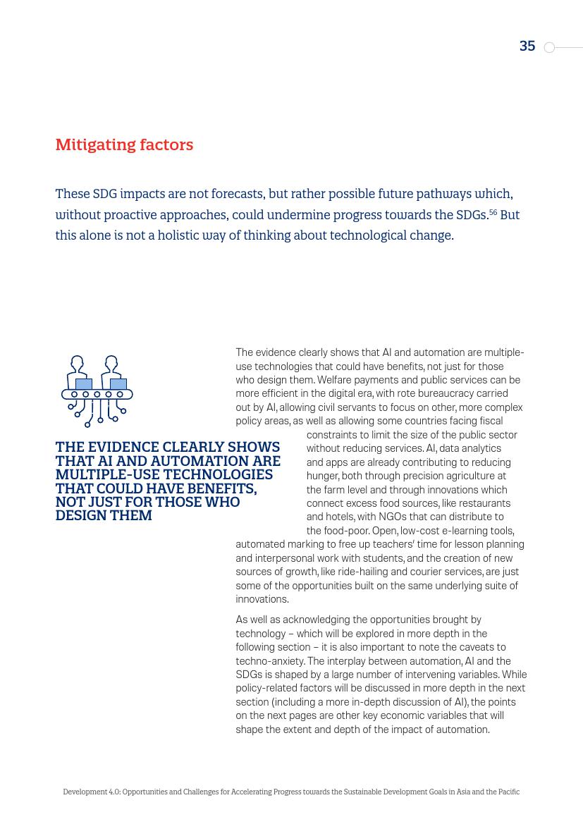 东亚的发展“奇迹”,从日本到“亚洲四小龙”,再到今天的马来西亚、越南、孟加拉国和泰国,其发展都建立在制造业领域,而现在,制造业面临自动化的风险。在服务业,面对自动化,广泛普及的英语技能以及低劳动力成本所带来的优势正在消失。人工智能和新的数字经济对实现一系列可持续发展目标来说,意味着即是机遇又是挑战。在最负面的自动化和人工智能情景中,至少九个可持续发展目标的进程可能会受到较大影响。