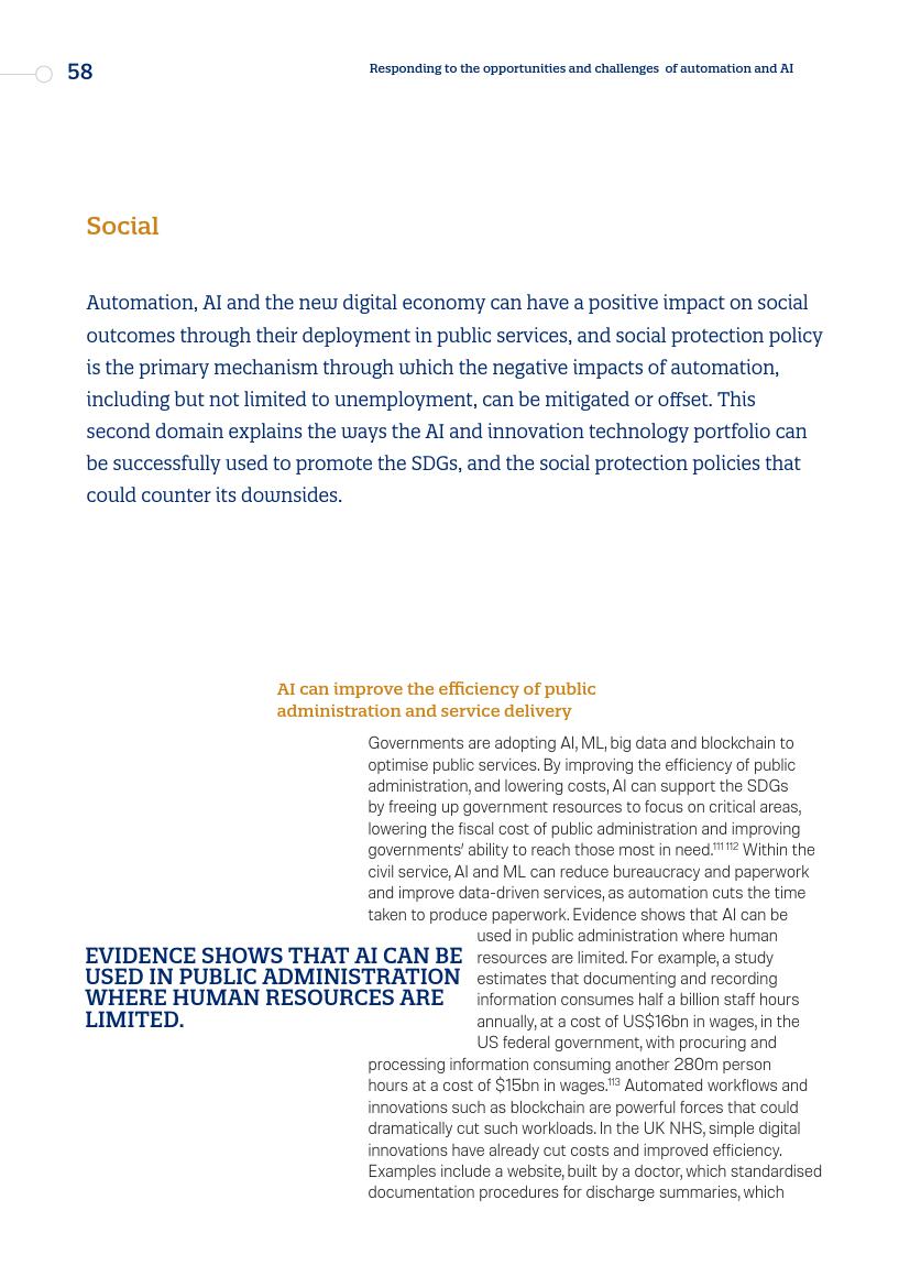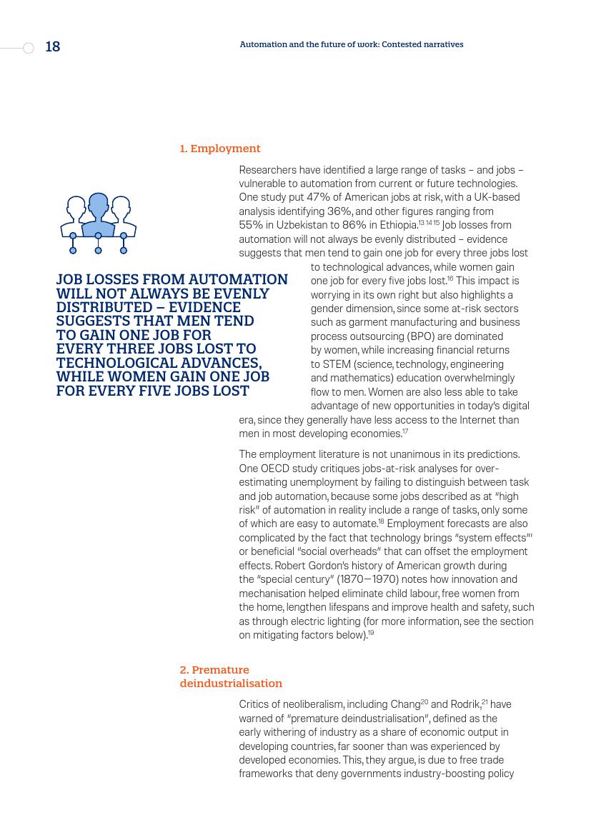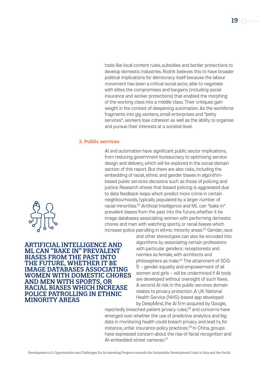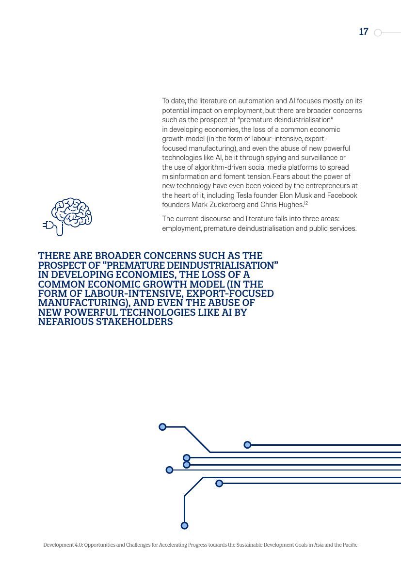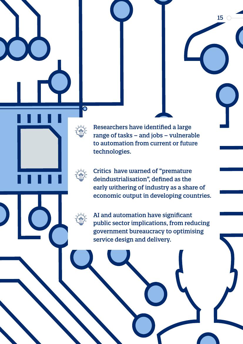专家对“过早去工业化(premature deindustrialization)”提出警告,“过早去工业化”被定义为发展中国家经济总量中工业部分的早期萎缩。另外,人工智能和自动化对公共部门的影响巨大,涉及到减少政府机构以及优化服务设计以及交付等方面。