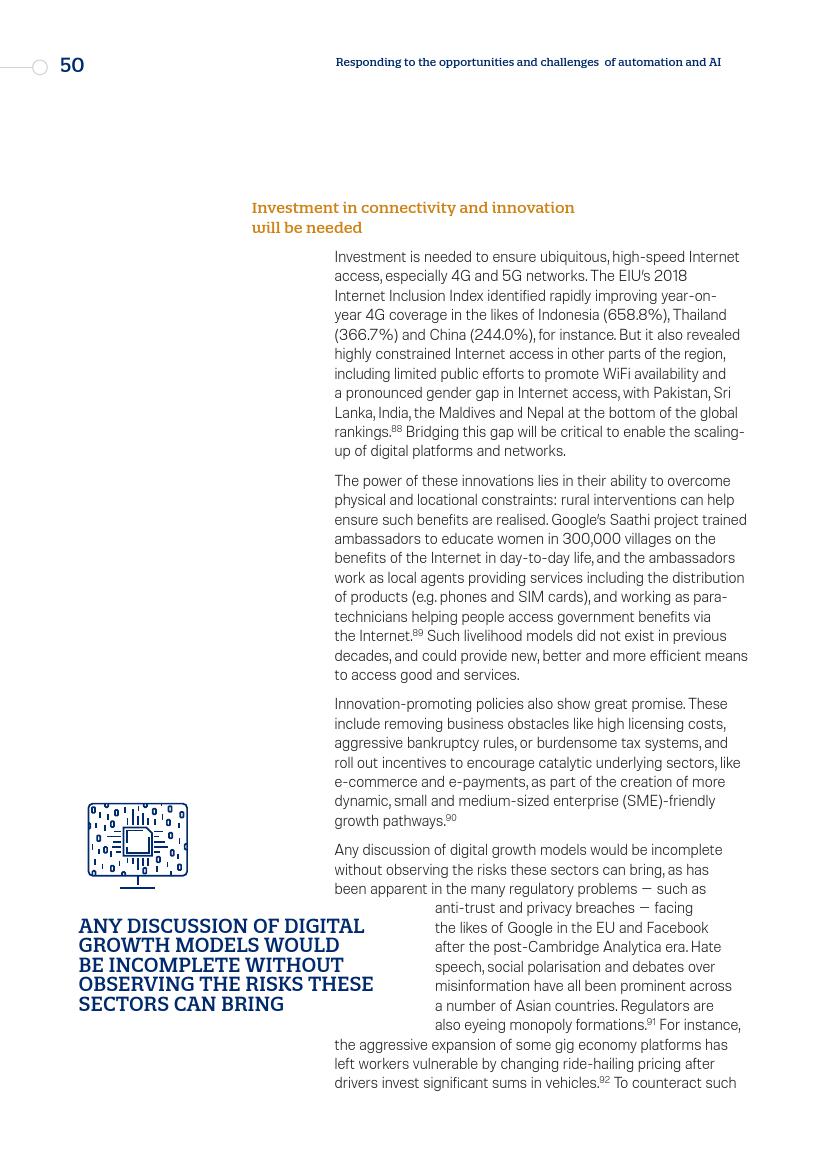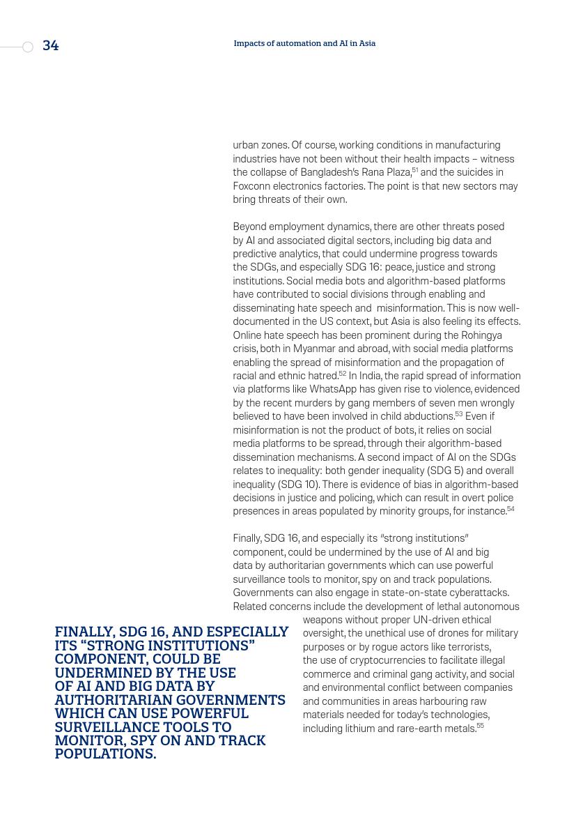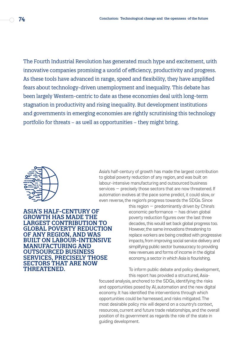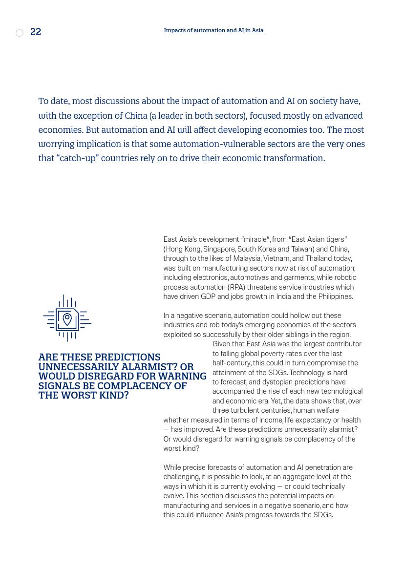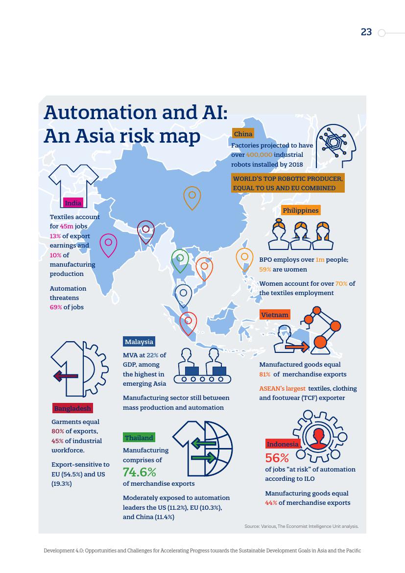 亚洲持续半个世纪的增长为全球减贫做出了巨大贡献,其基础是劳动密集型制造业和外包商业服务,而这些都是正在受到威胁的行业。如果自动化的发展速度达到某些人预测的那样,它可能会减缓甚至逆转该地区实现可持续发展目标的进程。