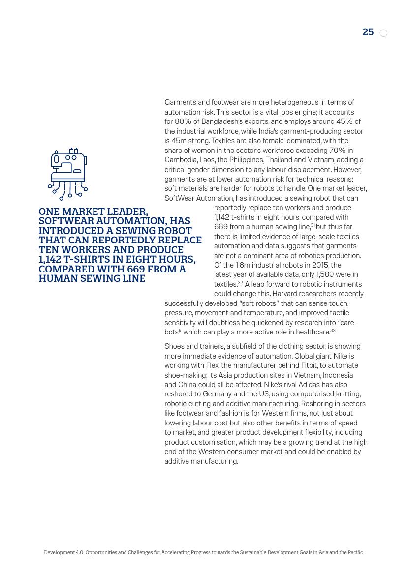 在印度尼西亚、菲律宾、泰国和越南工人从事的工作中,受自动化影响较大的工种占比超过60%。一个市场领导者——软件自动化,已经推出了一种缝纫机器人,据报告称,一个机器人可以代替十个工人,八小时内可以生产1142件T恤,而人类缝纫流水线的产量为669件。