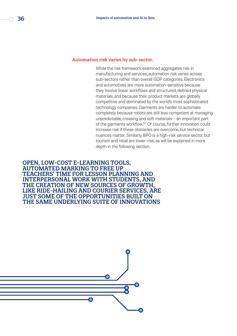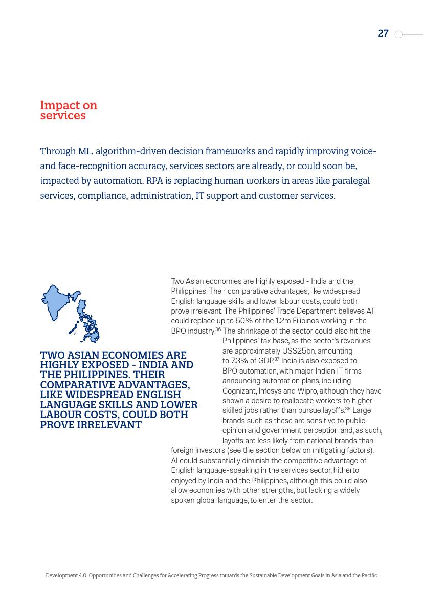 拥有机器学习、算法驱动的决策框架以及快速提高的语音和面部识别准确性,服务部门已经或者说很快就会受到自动化的影响。它们正在取代如律师助理、管理、IT支持和客户服务等领域的工作人员。两个亚洲经济体非常突出——印度和菲律宾。其所具备的比较性优势,如广泛普及的英语语言技能和较低的劳动力成本,可能都将被证明不再如此重要。