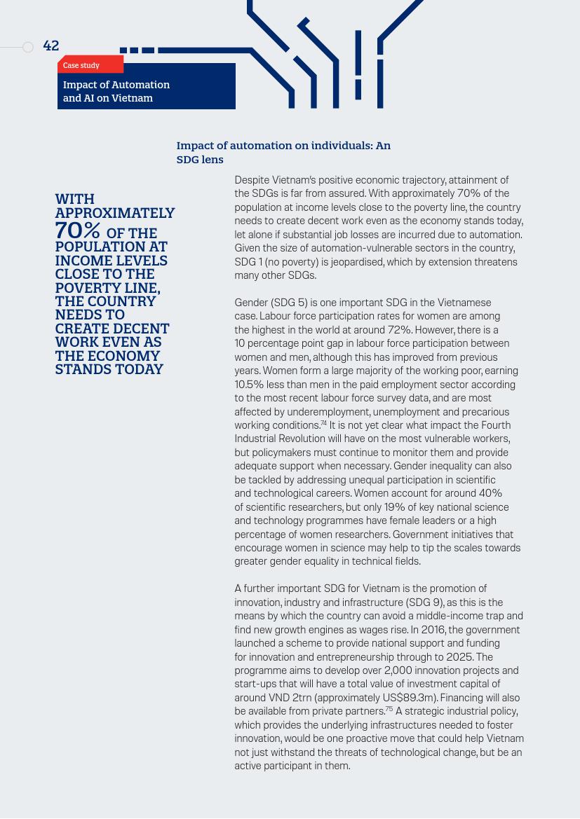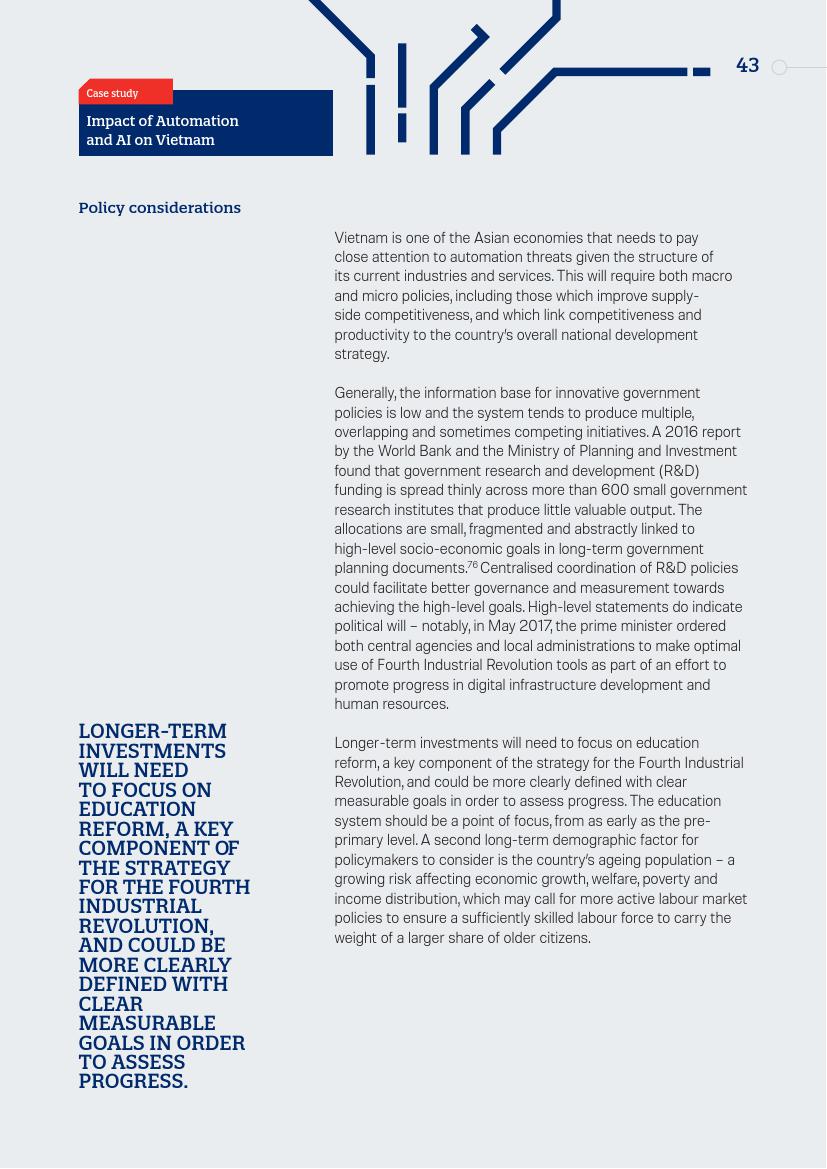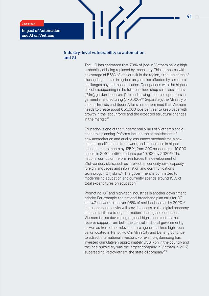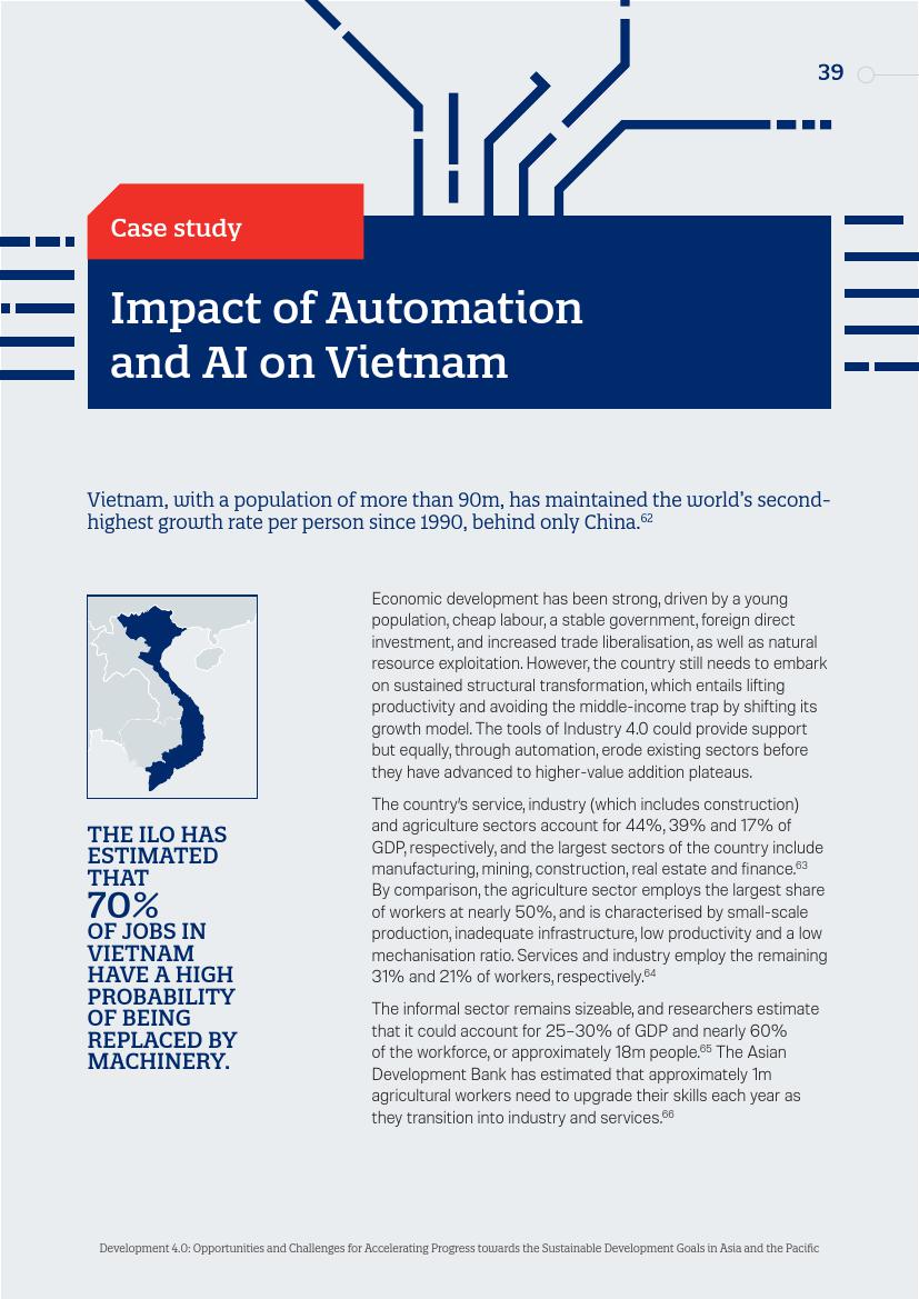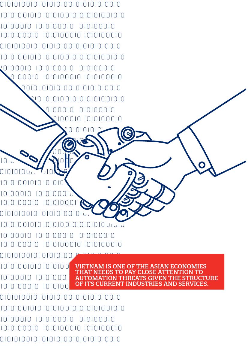 越南是一个需要高度关注自动化威胁的亚洲经济体,这是由于其当前的工业和服务业结构所决定。大约70%的人口处于收入水平贫困线的边缘,即使站在今天的经济立场而言,国家需要创造劳动机会。