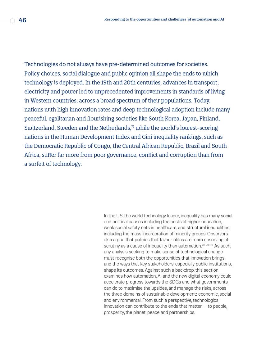 此外,技术并非总是为社会带来预先确定的结果,在19世纪和20世纪,交通、电力和电力技术的进步导致了西方国家生活水平的空前提高,这些国家的人口范围非常广泛。如今,拥有高创新率和深度技术采用的国家都已经成为和平、平等、繁荣的社会,而在人类发展指数(Human Development Index)和基尼系数不平等排名(Gini inequality rankings)等方面得分最低的国家,治理不善、冲突和腐败所造成的损失要远远大于这些技术泛滥的后果。