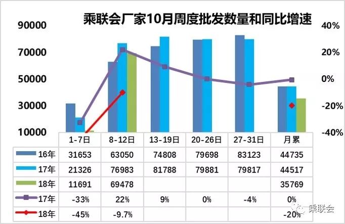 乘用车批发走势起步相对低迷,随后持续改善。第一周的日均批发达到1.17万台的日均水平,同比增速是-45%,走势不强的原因估计是9月市场较差,企业月末的冲刺较强。由于9月最后一周的批发销量稍强,形成对10月的市场的暂时影响。10月第二周的批发达到日均6.9万台,同比增速-9.7%,增速明显改善。由于去年同期的批发偏高,今年10月初的表现相对一般。去年第三周后的批发并未拉升,本月未来几周批发应该会有一定改善。