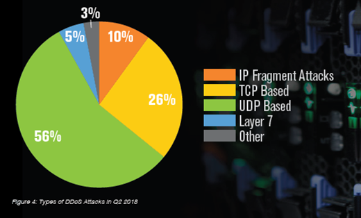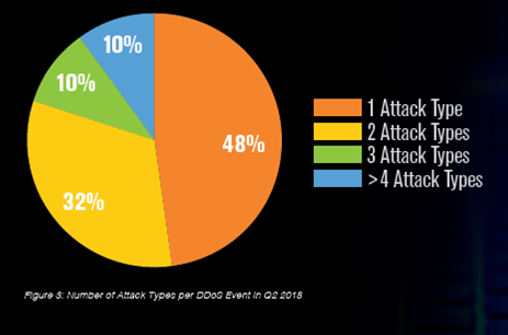 第二季度,58%的DDoS攻击超过1 Gbps。 虽然第二季度攻击数量比第一季度有所增长,攻击高峰平均值减少了49%。2018年第二季度遭遇DDoS攻击的客户中有62%被多次定位。总体而言,DDoS攻击仍然无法预测,并且在速度和复杂性方面差异很大。