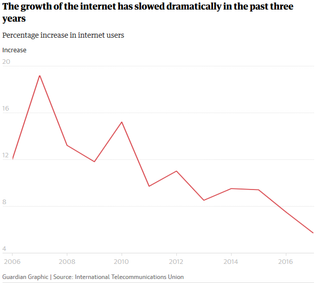 联合国的数据显示,全球互联网接入的增长率从2007年的19%降至2017年的6%。