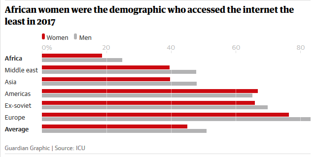 如果增长率在2005-2017年稳定在11%,那么全球将增长5亿网民。在仍然没有上网的38亿人中,女性数量惊人。在贫困的城市地区,上网男性和女性比例可达到2:1.