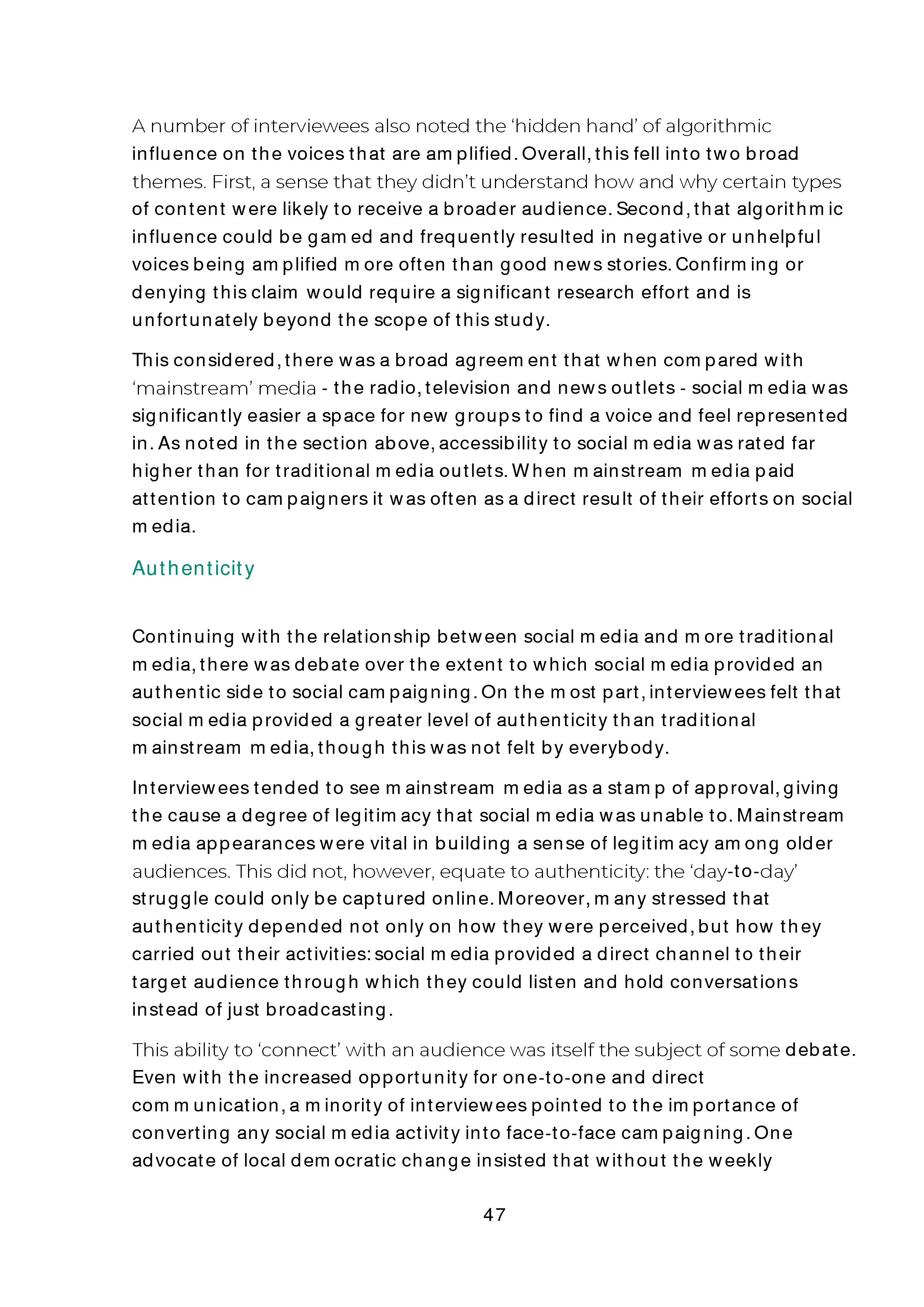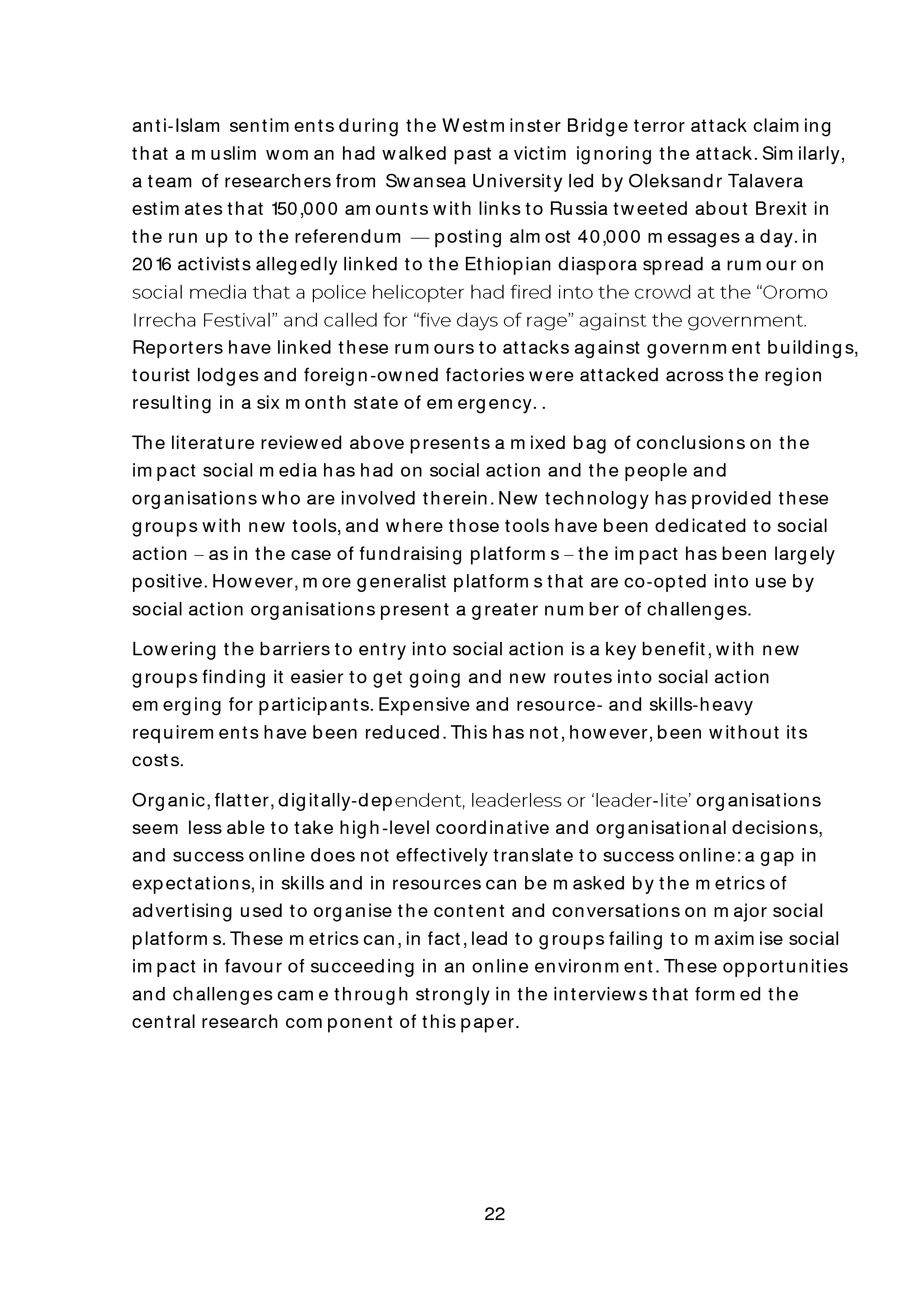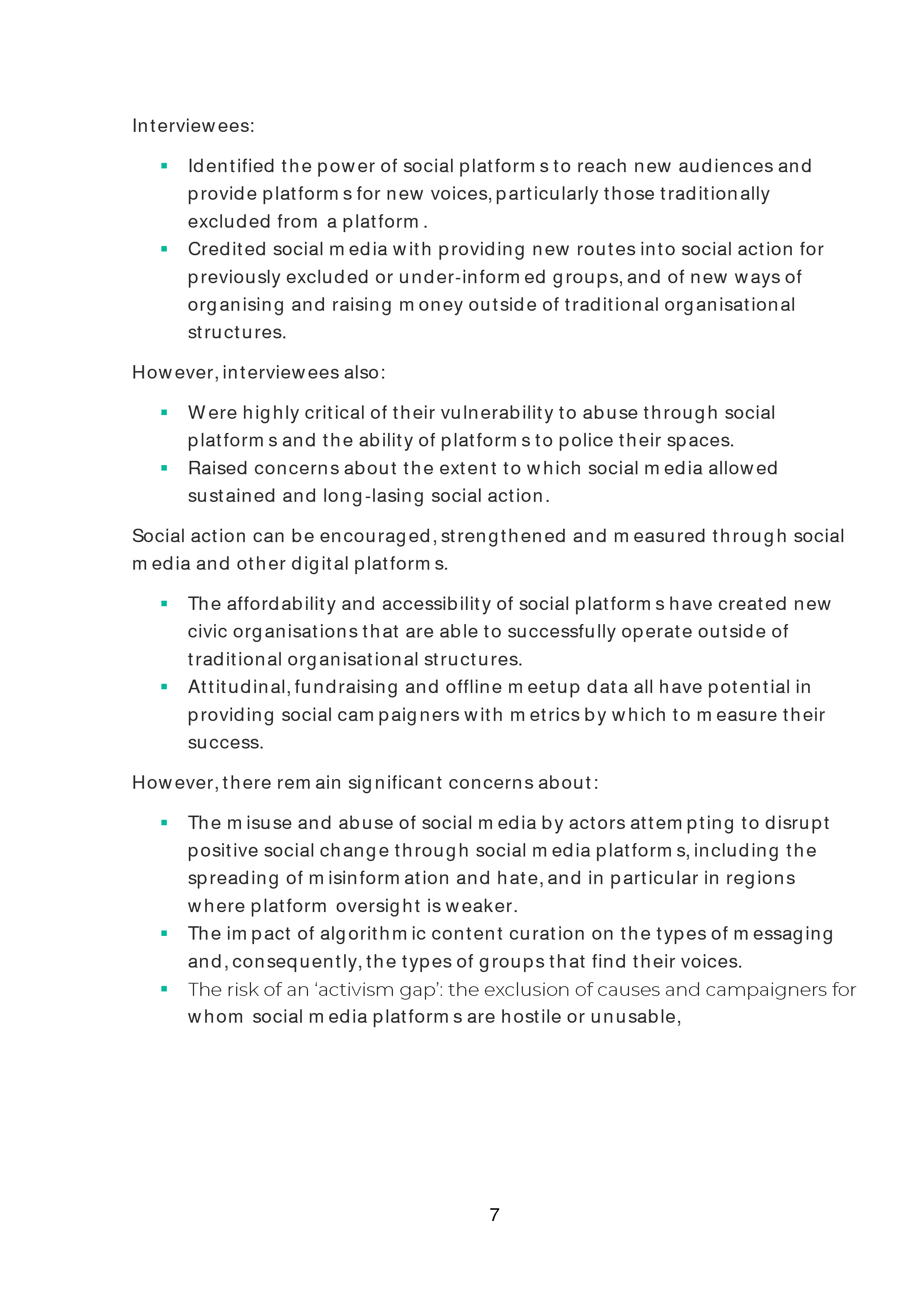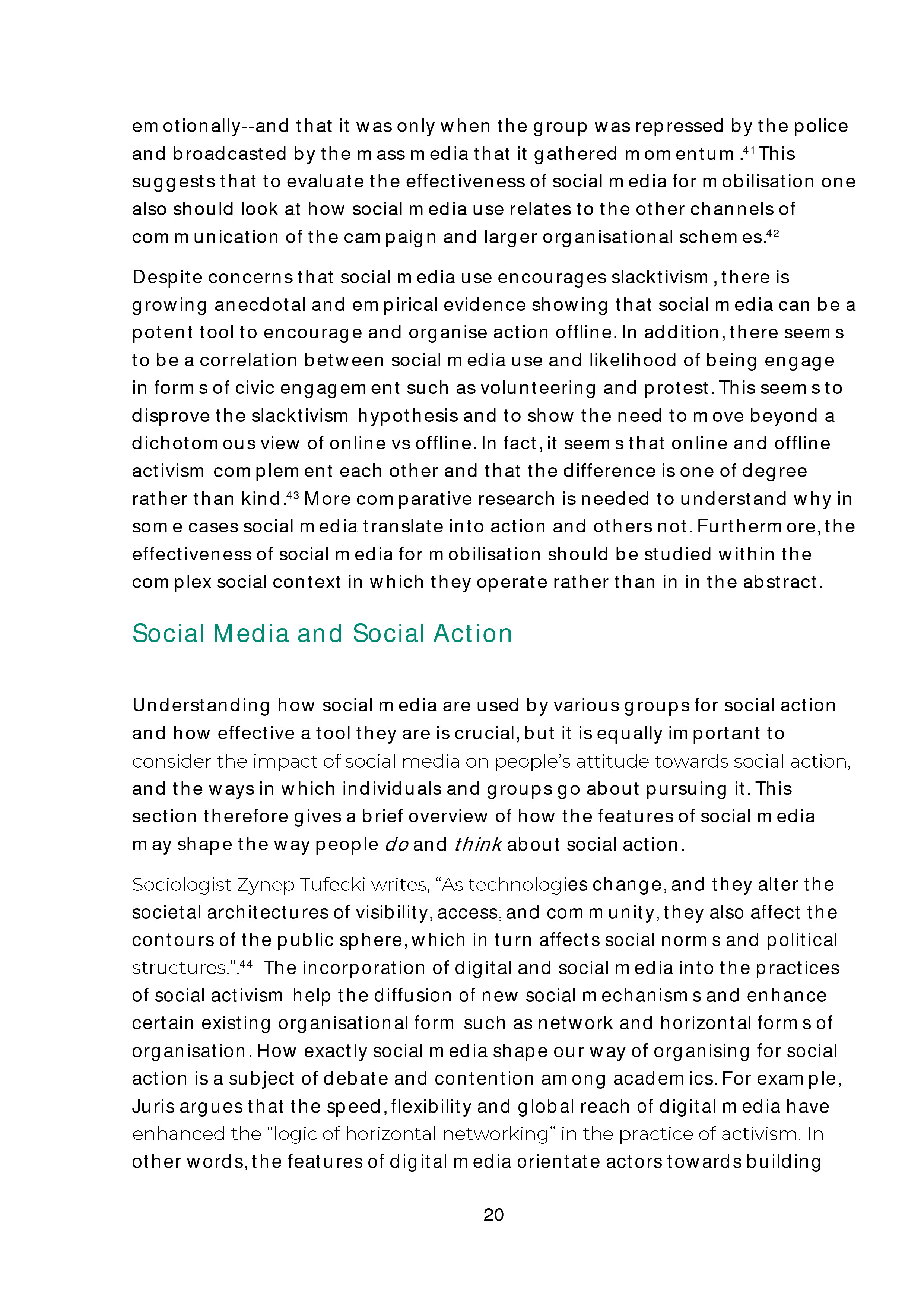 社交媒体是一种力量的倍增,社交媒体平台是积极的社会变革的有力工具,但是使用不当也可能造成相当大的伤害。滥用社交媒体可能颠覆积极的社会变革,包括传播错误的信息和仇恨;算法对消息类型以及发现其声音的组织类型的影响;以及激进主义风险等。