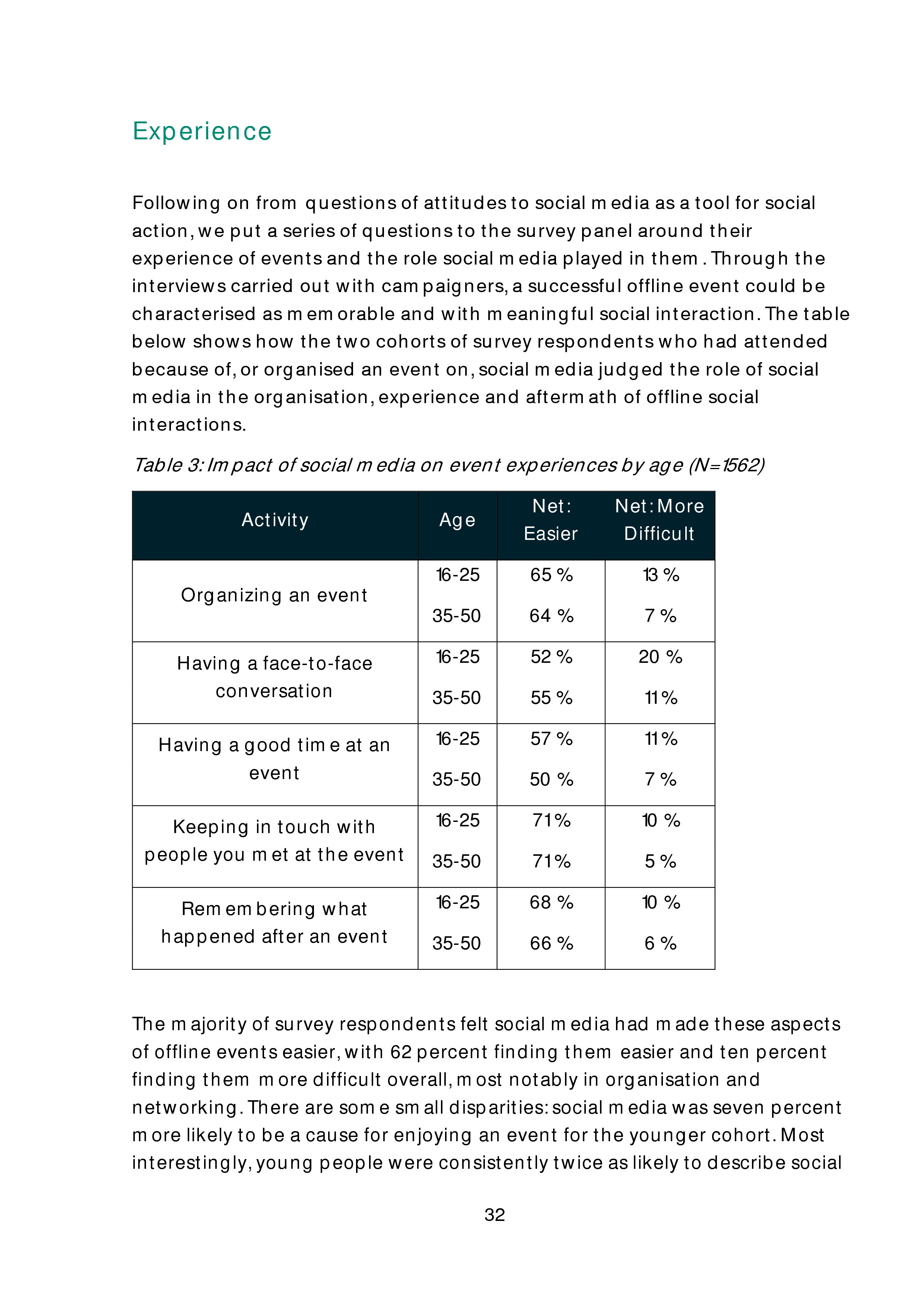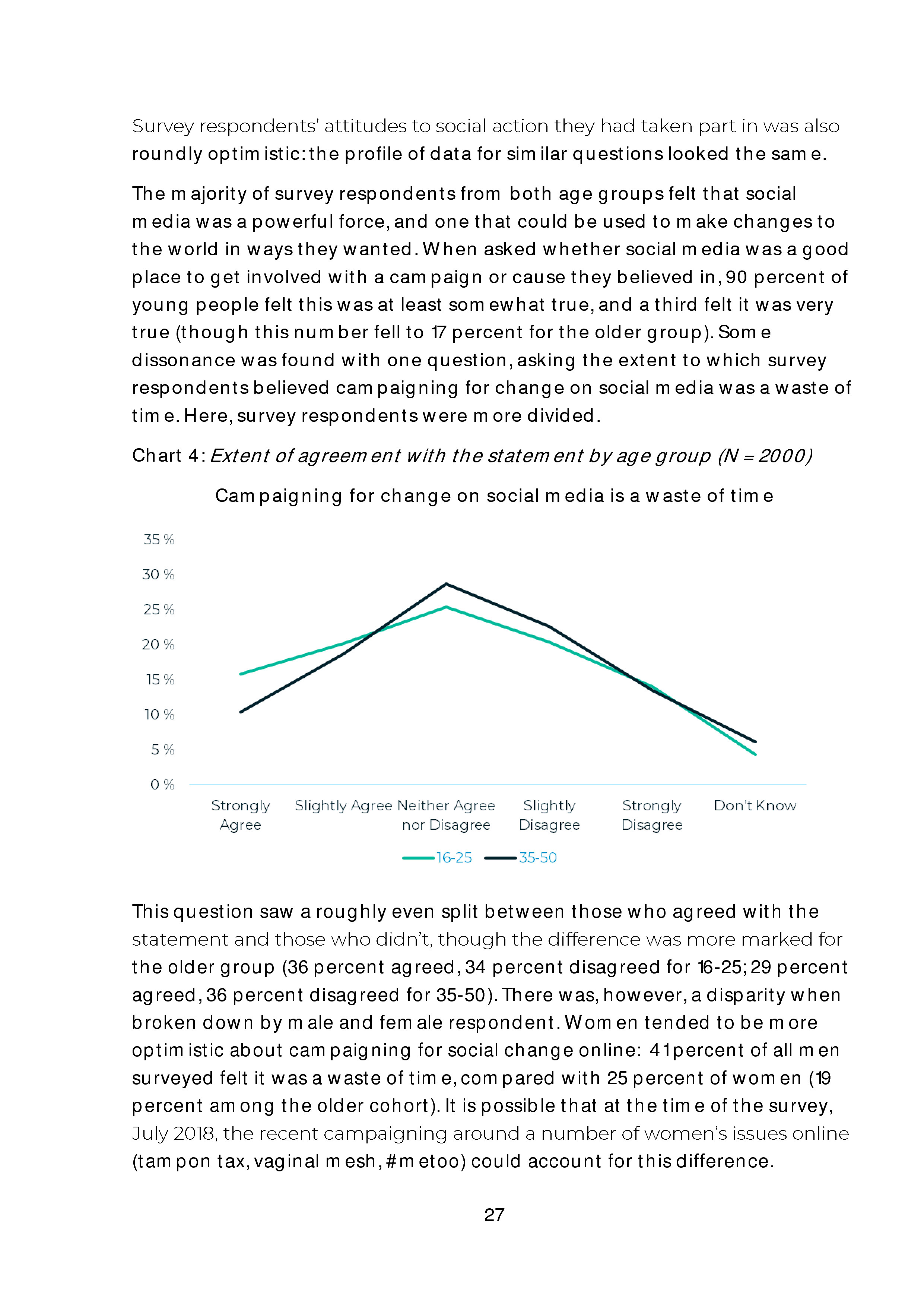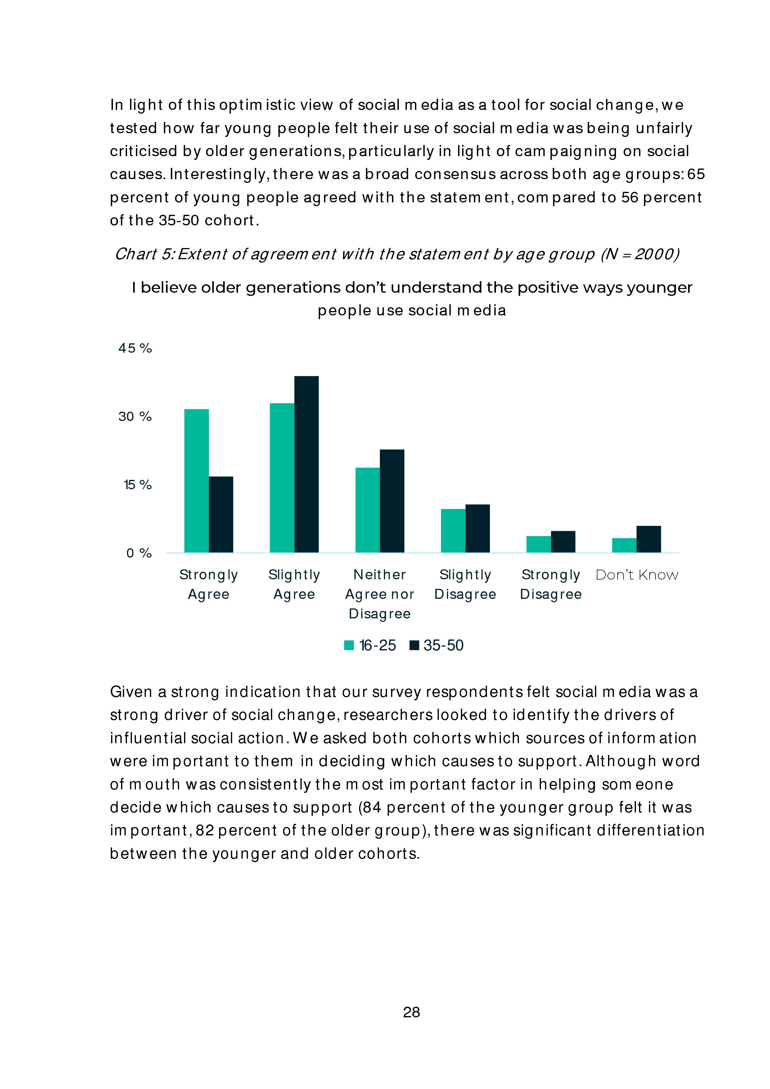 近2/3的年轻人(64%)认为社交媒体平台是实现社会变革的重要组成部分,超过一半的35-50岁年轻人同意这一说法(55%)。