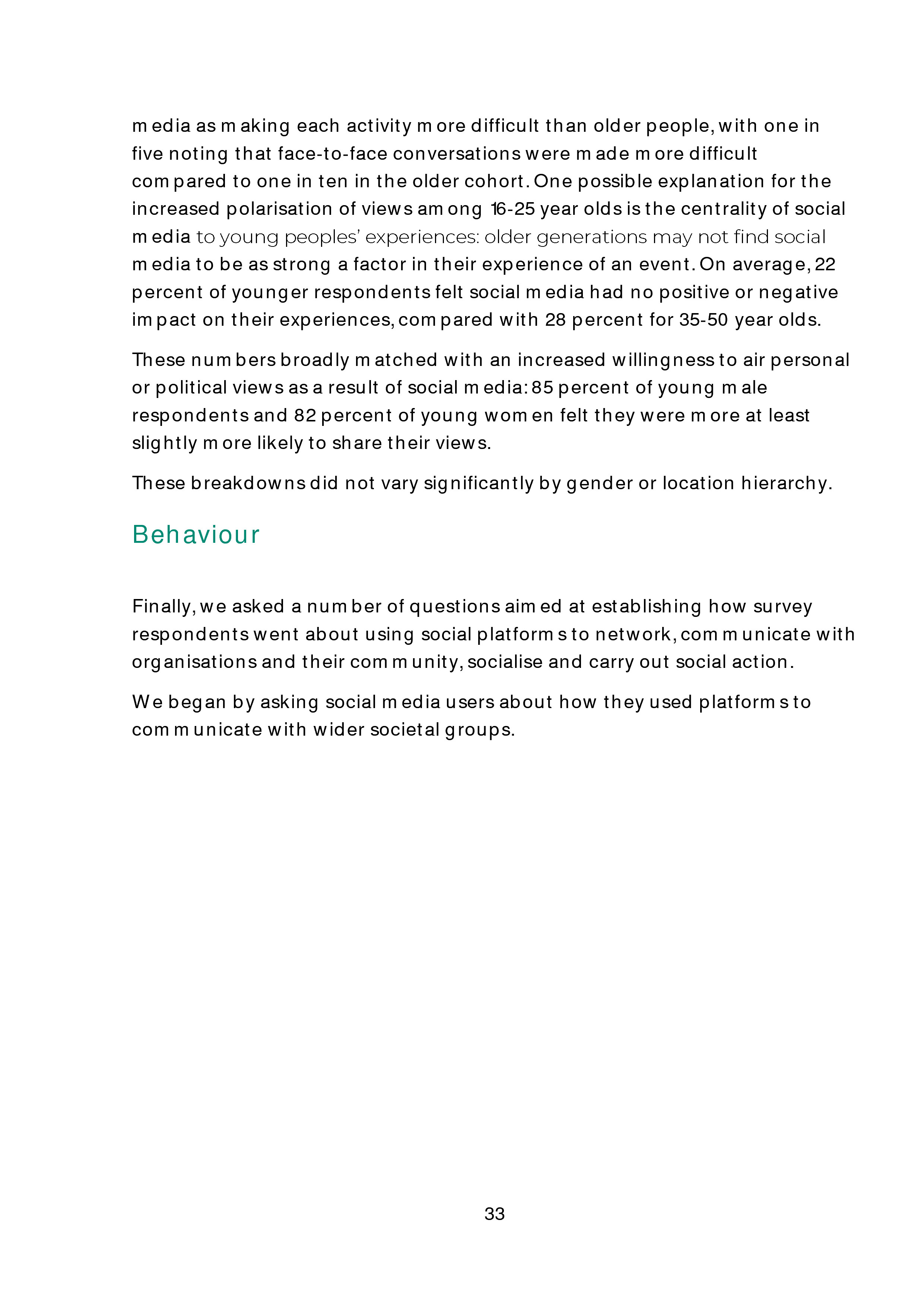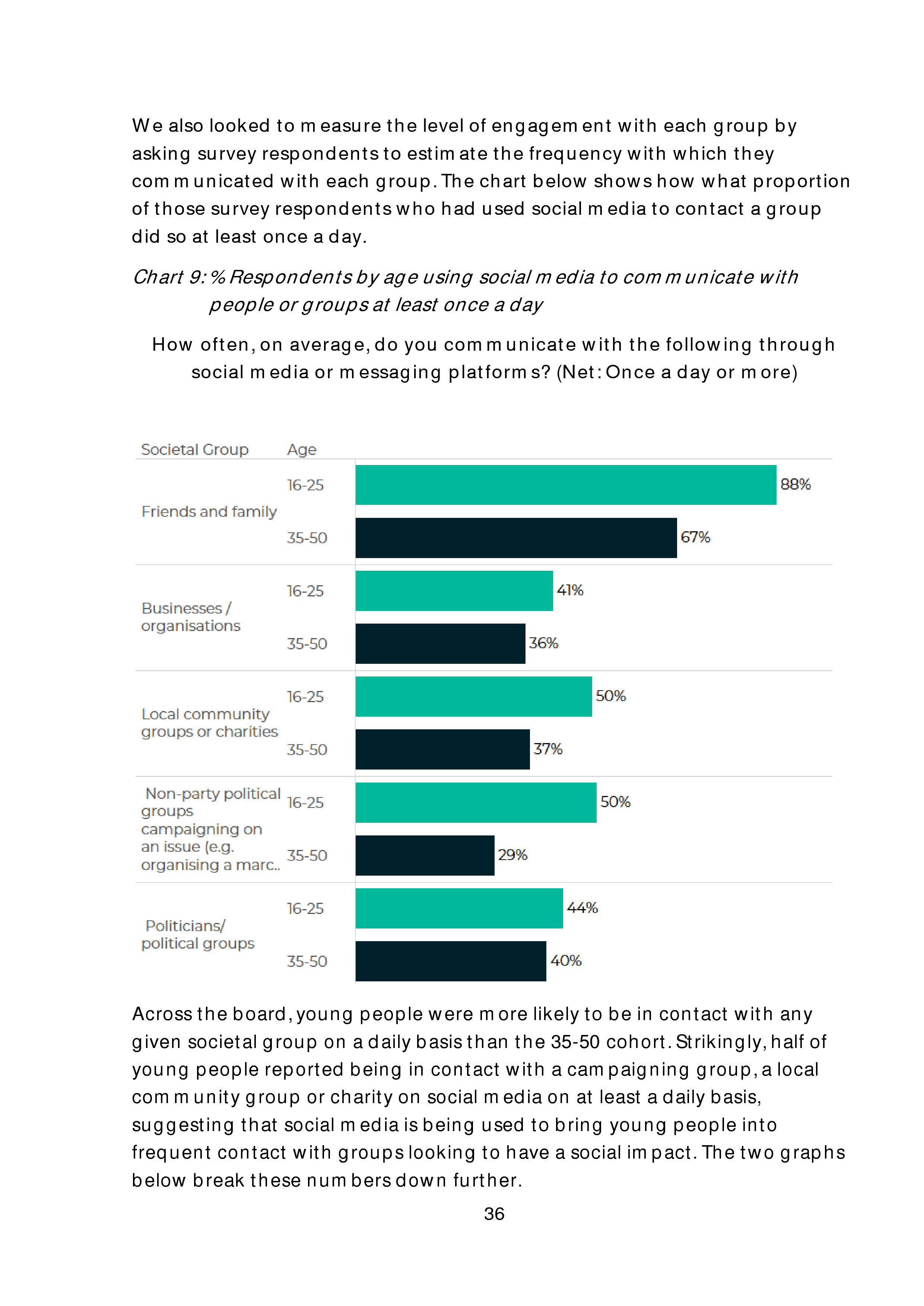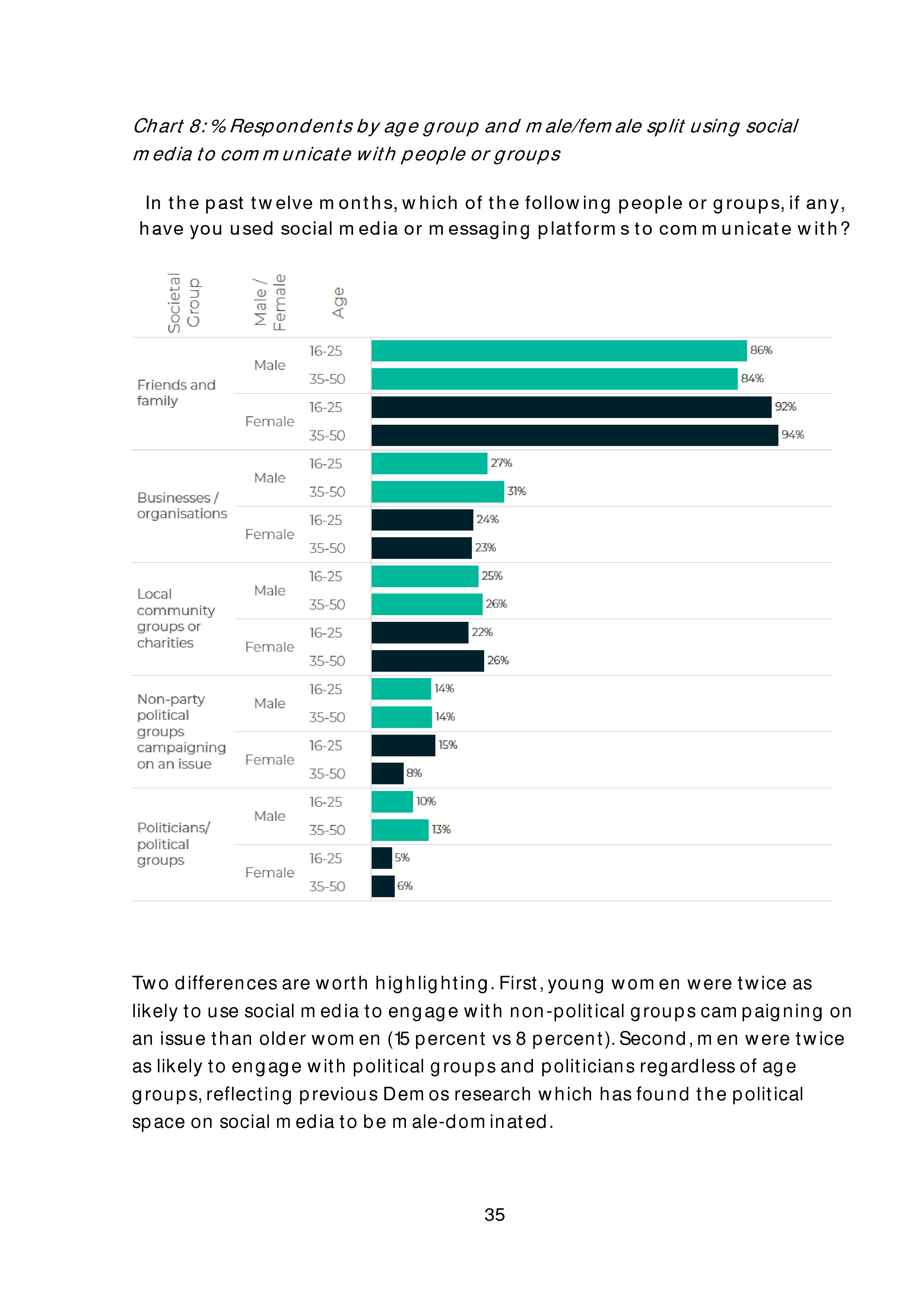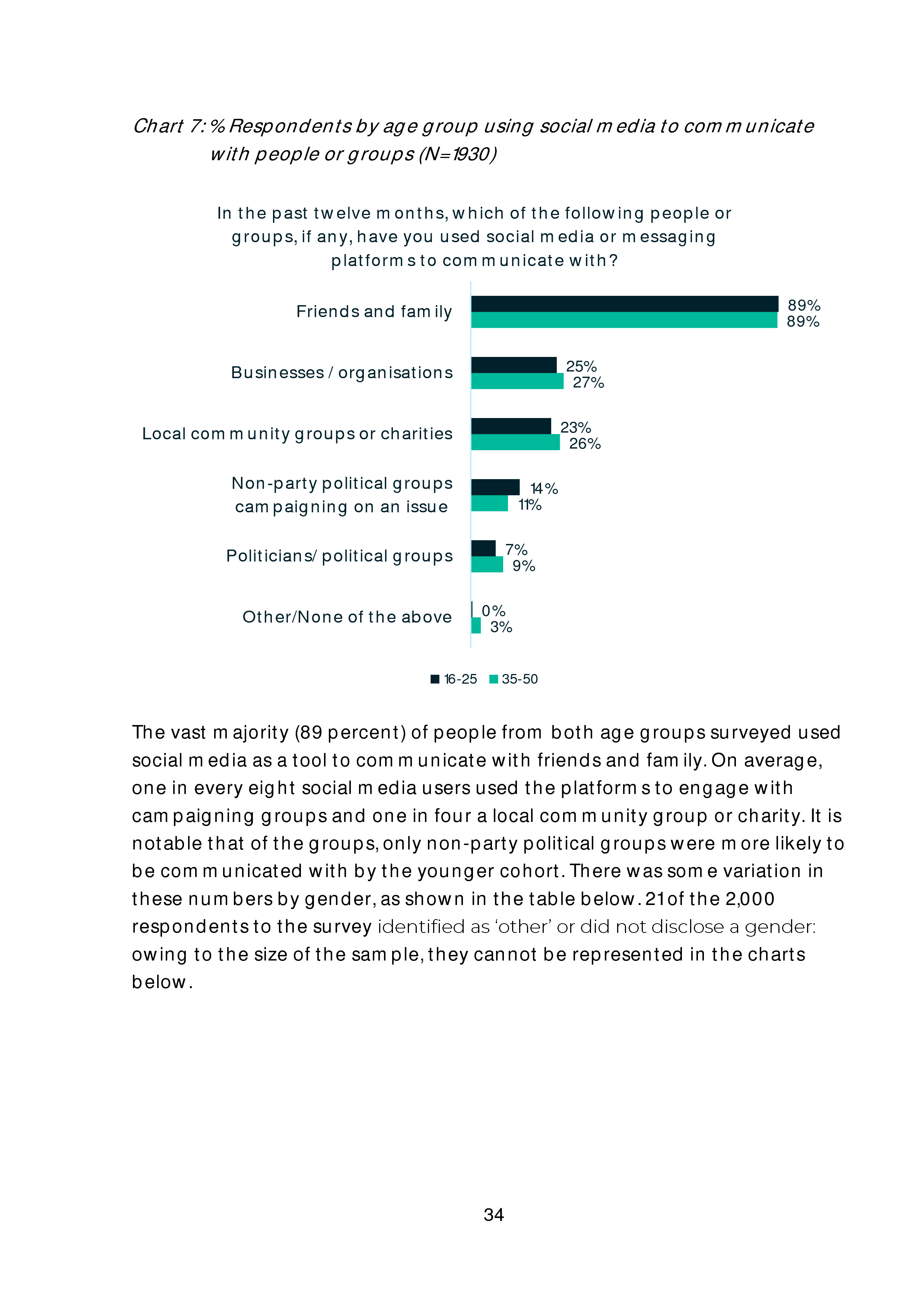 在过去的12个月中,7%的年轻人使用社交媒体与政治家或政治团体直接进行过沟通。根据英国人口推算,这相当于大约50万年轻人在线与政治团体沟通。在这些人中,有一半人每周使用社交媒体直接沟通。