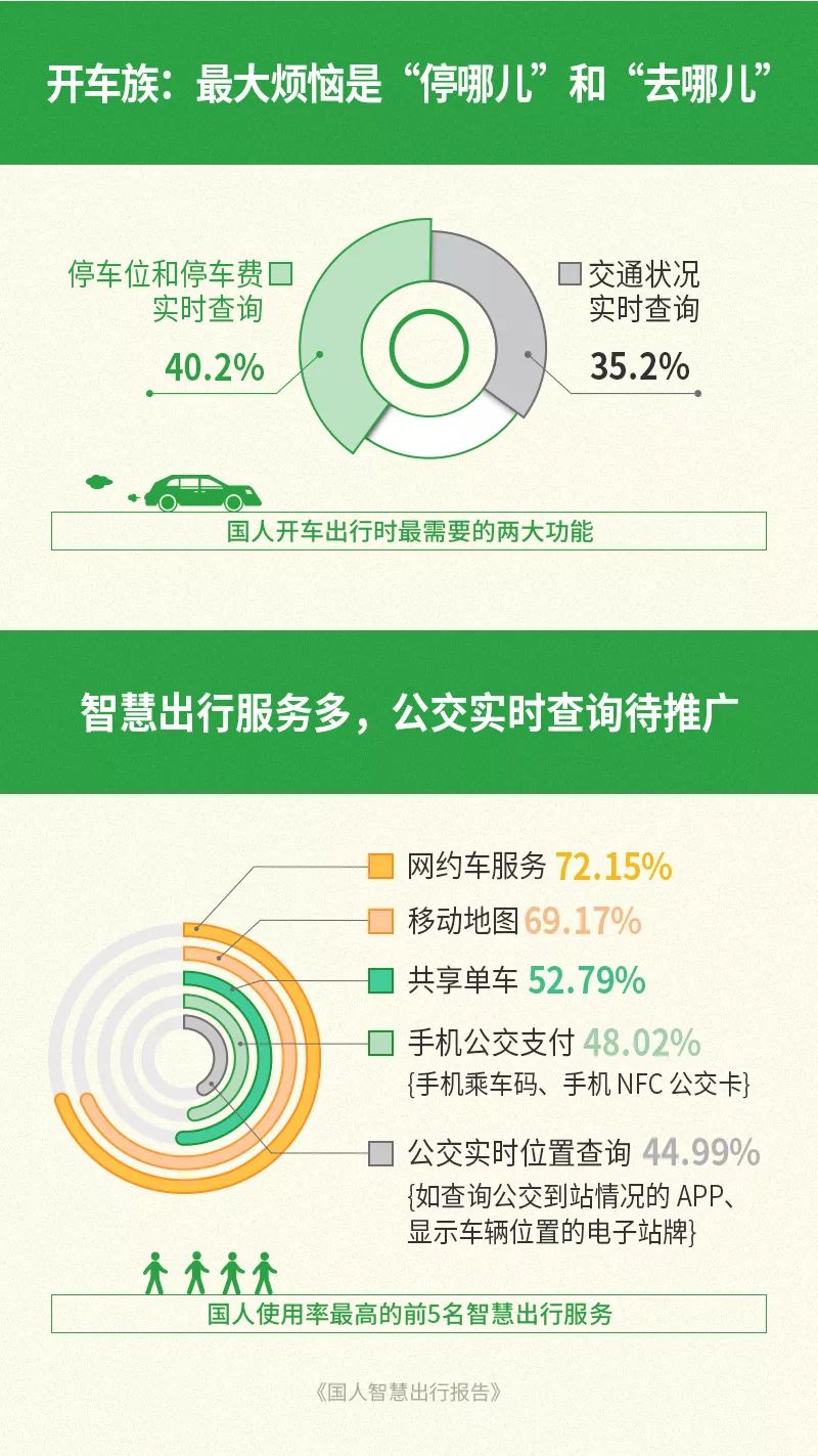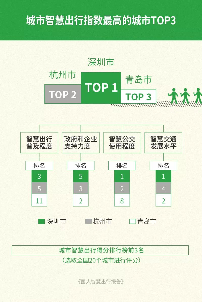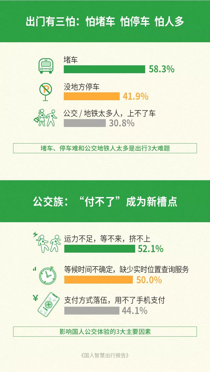 腾讯:国人智慧出行报告 近日,腾讯金融科技智库发布《国人智慧出行报告》(以下简称“报告”)。报告通过对全国多个城市的智慧出行数据进行调研,从国人出行现状、国人智慧出行使用程度、国人对智慧出行的认知与展望、政府与企业对智慧出行的支持程度四个方面系统分析了国人智慧出行的现状。 一图读懂《国人智慧出行报告》 ●出行有3怕:怕堵车、怕停车、怕人多 ●7成一线城市居民选择公交地铁 ●超4成公交族的困扰:支付方式落后 ●滴卡族仍是主力,刷“码”族成新潮流 ●智慧出行城市TOP3:深圳、杭州、青岛 ●“码”不停蹄的城市TOP3:深圳、广州、西安 近日,腾讯金融科技智库发布《国人智慧出行报告》(以下简称“报告”)。报告通过对全国多个城市的智慧出行数据进行调研,从国人出行现状、国人智慧出行使用程度、国人对智慧出行的认知与展望、政府与企业对智慧出行的支持程度四个方面系统分析了国人智慧出行的现状。 以下为《国人智慧出行报告》全文: 更多阅读:惠租车:2014国人海外自驾游报告尼尔森:国人白酒消费回归理性智慧出行持续加码,微信支付携手同程上线清远市民刷码乘车便捷体验国人工资报告–信息图世界品牌实验室:2024年度《世界品牌500强》排行榜 苹果登顶 腾讯国内第二腾讯:2023年腾讯员工数超10万 人均年薪破100万腾讯:2022年腾讯员工人均年薪为102.53万元 同比增加了近20万元中国网科技:60.7%的年轻人认为当前职业比较满意快乐腾讯:2022年7月腾讯未成年人的游戏时长已经同比下降了92%腾讯:2020年度腾讯研发大数据报告胡润:2012年胡润品牌榜 中移动再居首位 腾讯排第7报告:加速全球山地森林的消失威胁到热带生物多样性热点地区陌陌:2021网民身材焦虑报告腾讯:2025年Q2雇员达11.12万,微信月活14.11亿QuestMobile:2025年9月全网用户12.69亿,同比增长2%