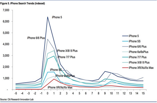 在新iPhone发布之前和之后的一段时间,民众会从谷歌搜索查找新机,了解相关信息;而花旗对搜索数据进行分析,就能判断用户的兴趣变化。