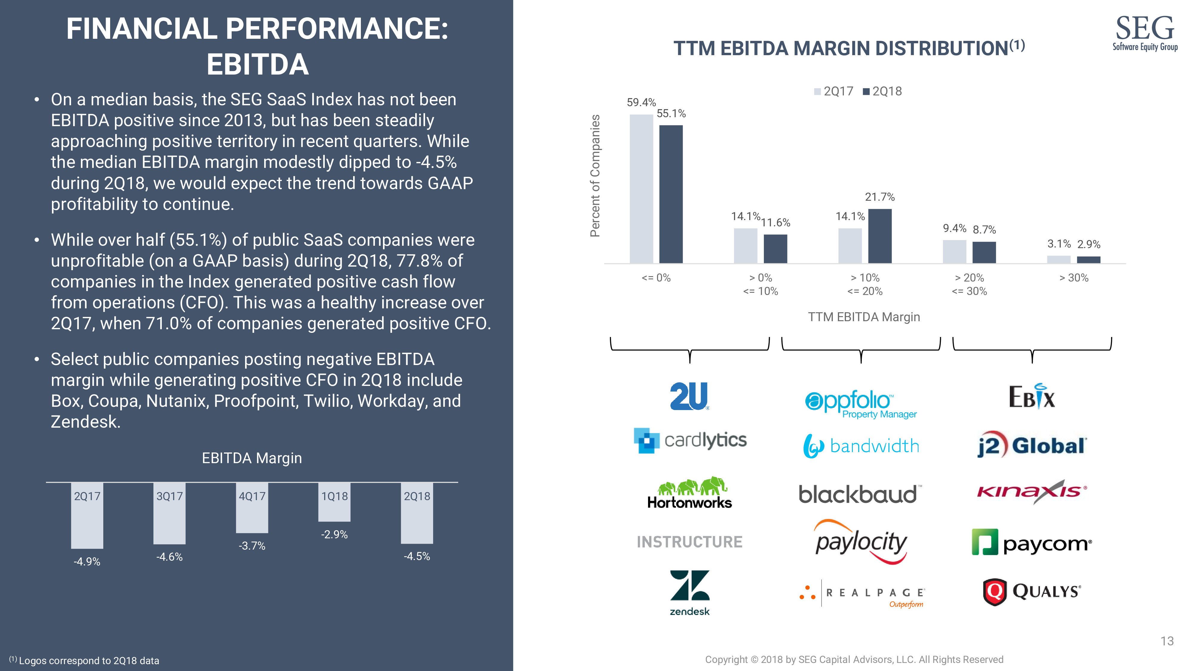 从中位数来看,SEG SaaS指数自2013年以来从未获得EBITDA利好,但近几个季度一直稳步接近正值区域。虽然2018年第二季度EBITDA中位数温和下降至-4.5%,但预计GAAP盈利能力的趋势将持续。