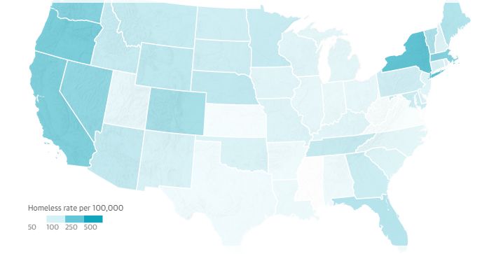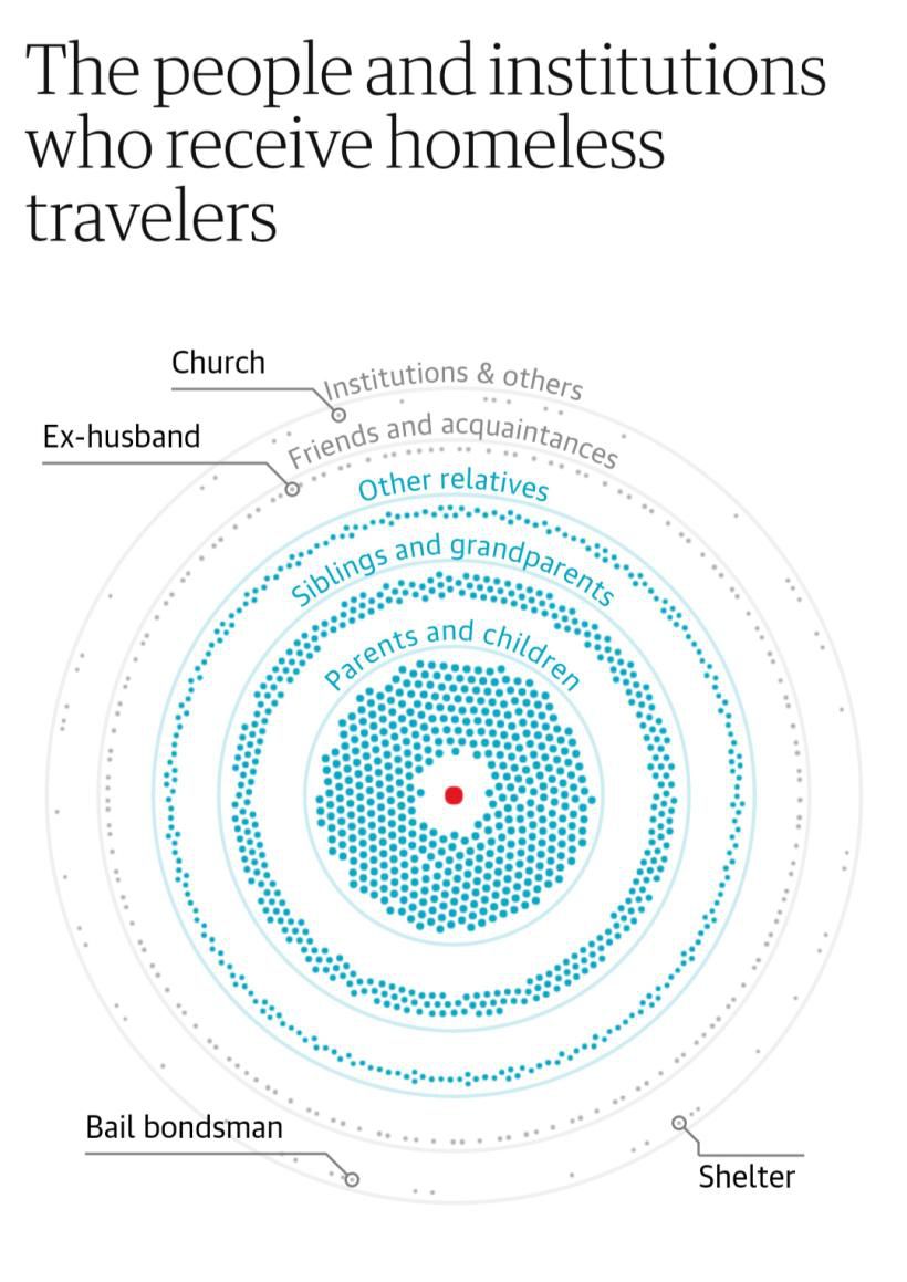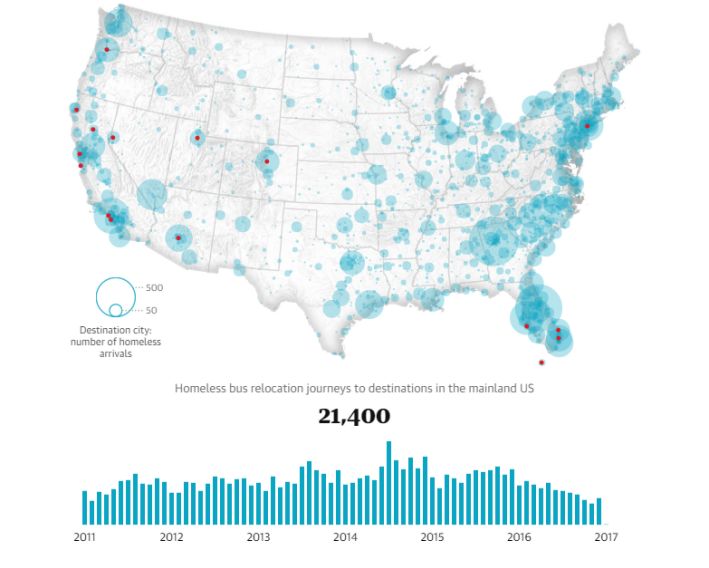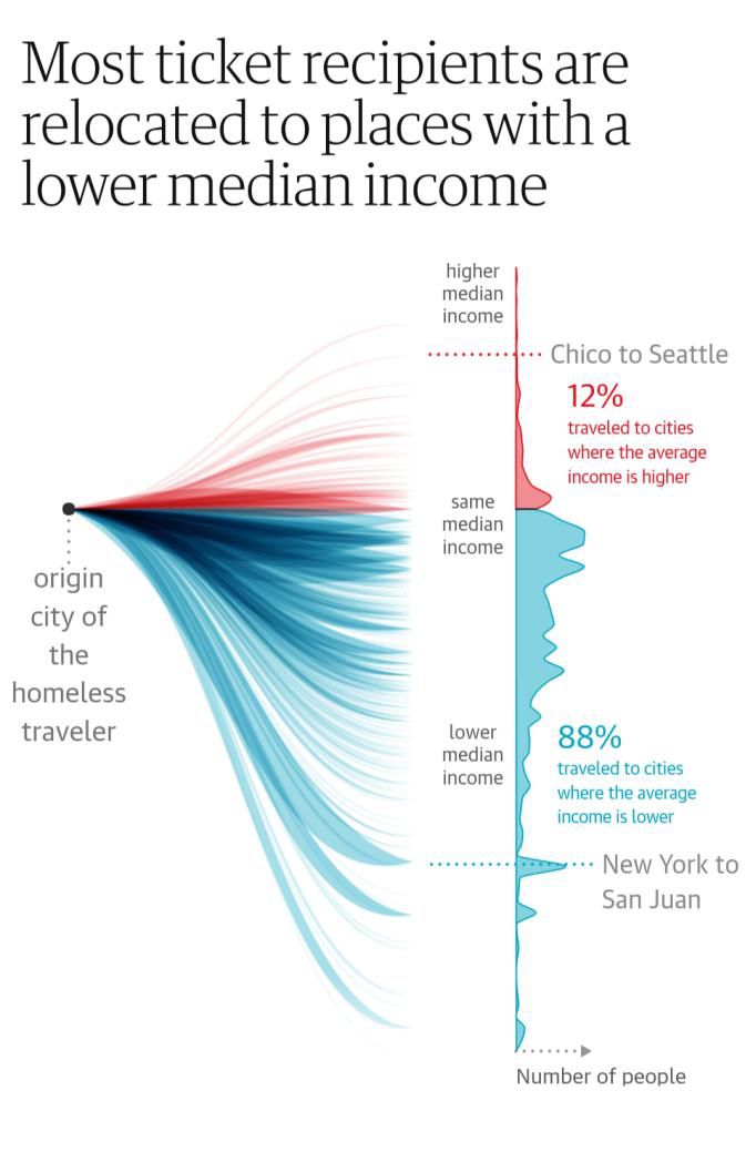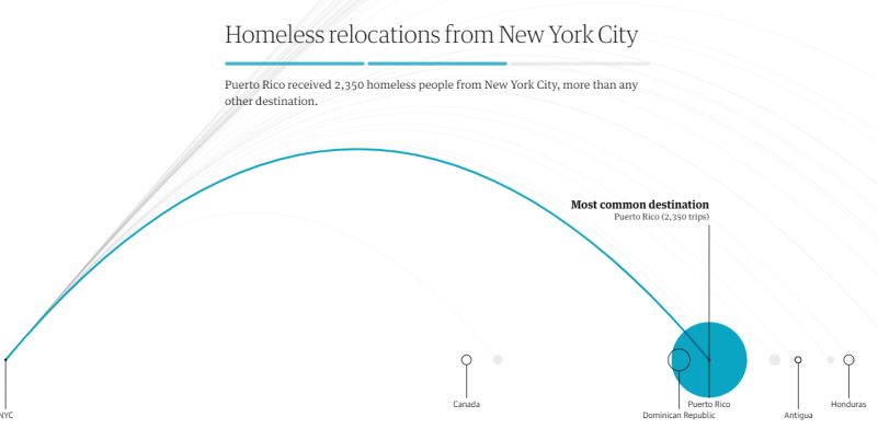 报道从海量的数据之中进行意义建构,具体回答了“美国各州无家可归者占比”“美国主要城市无家可归人员的比例”、“无家可归者流动方向及城市”、“纽约无家可归者海外流向”、“接纳地收入状况”以及“是谁和那些组织在接纳无家可归人员”等问题。通过利用结构性的数据,该报道为读者过滤冗杂信息,简洁直观地解释了报道中所涉及的核心概念,为读者提供了获取重要信息的便捷性。