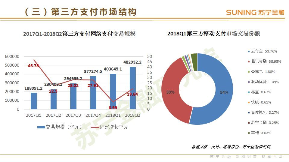 第三方支付行业:从2017年一季度到2018年二季度,第三方支付行业网络支付交易规模持续增长,但增速明显下降,表明市场趋于成熟。从市场格局看,支付宝和财付通在移动支付领域占据绝对主导地位,合计市场份额超过90%。
